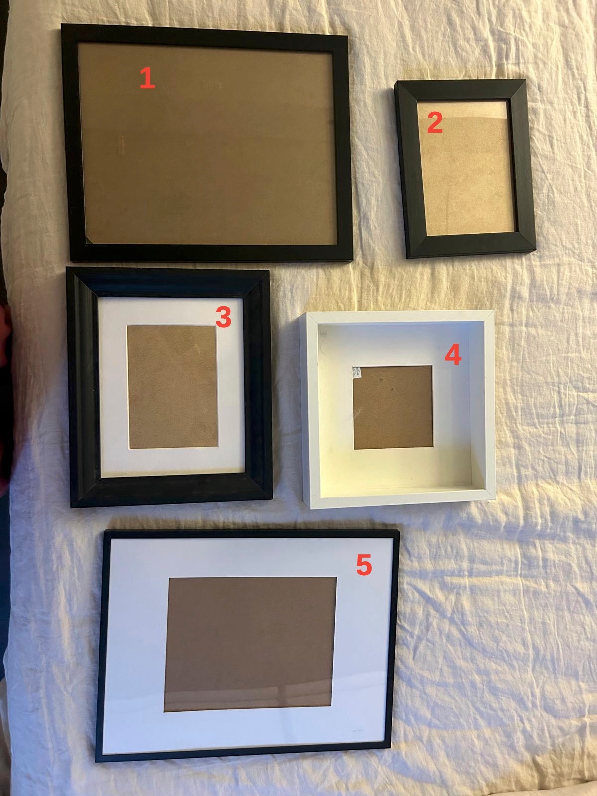 5 photo frames. $5 each, or $15 for all 5. Measurements below: