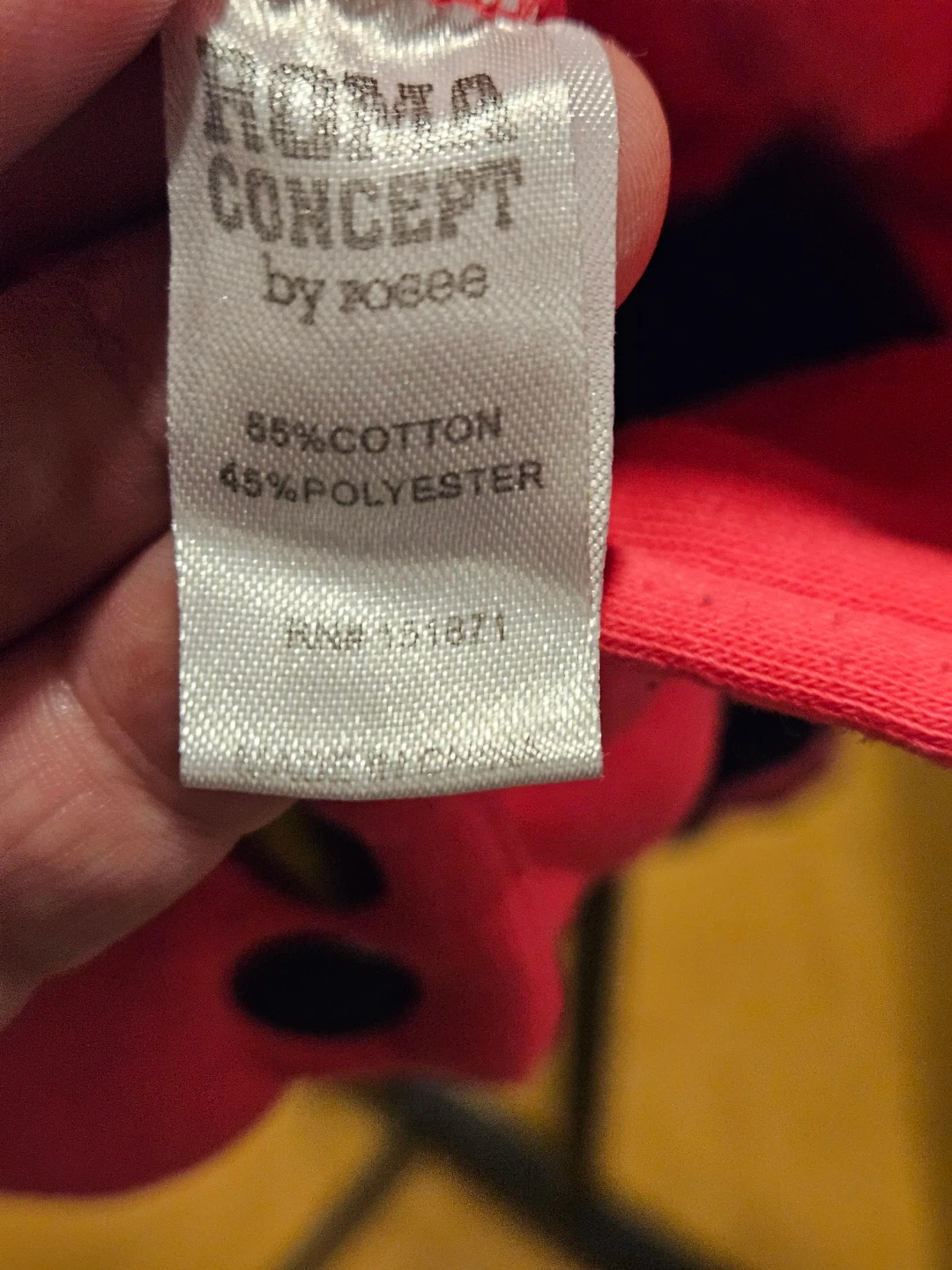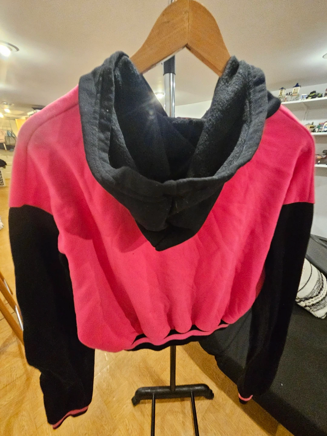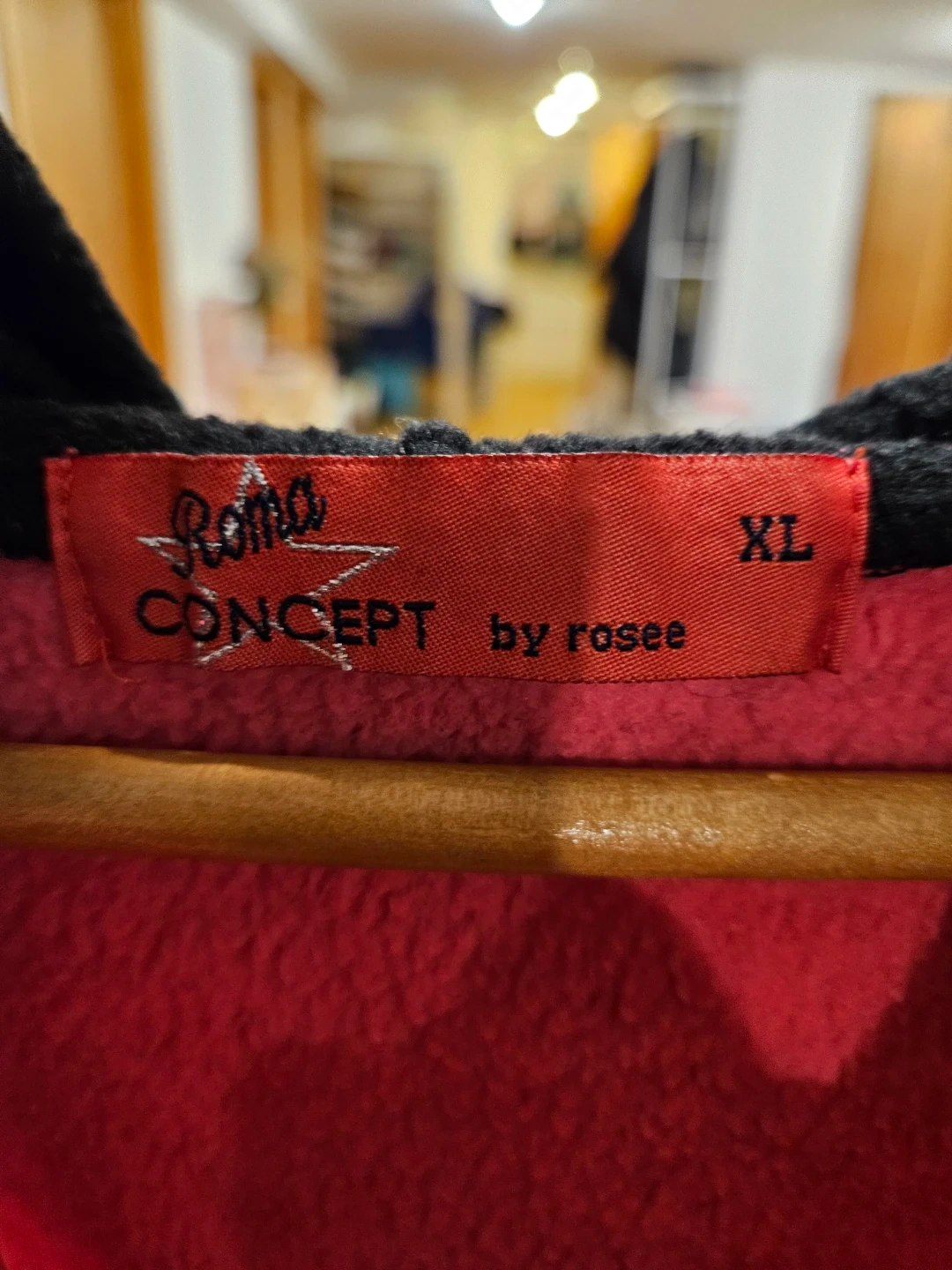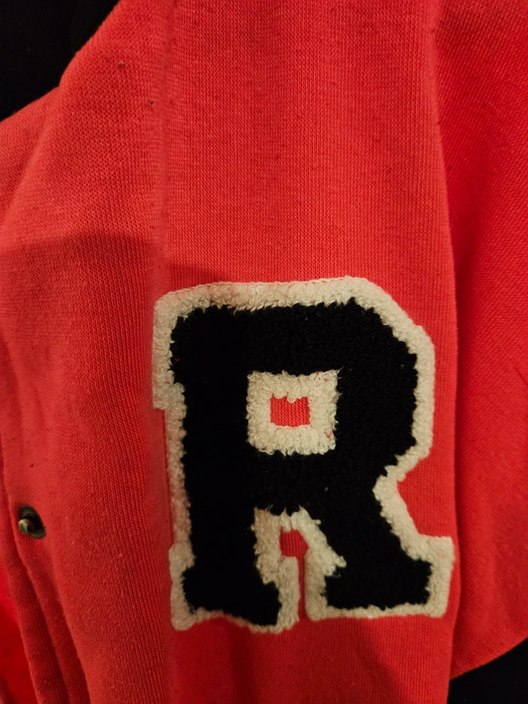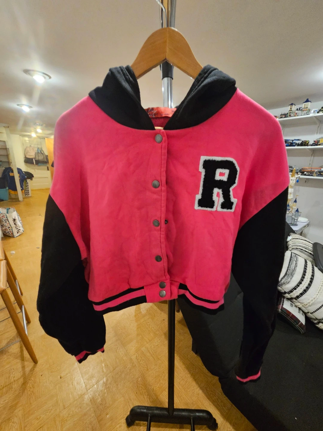 Roma Concept by Rosee varsity jacket. Features a pink body with black sleeves and hood. Includes a chenille "R" patch on the chest and snap button closure. Made of 55% Cotton and 45% Polyester. Size XL.