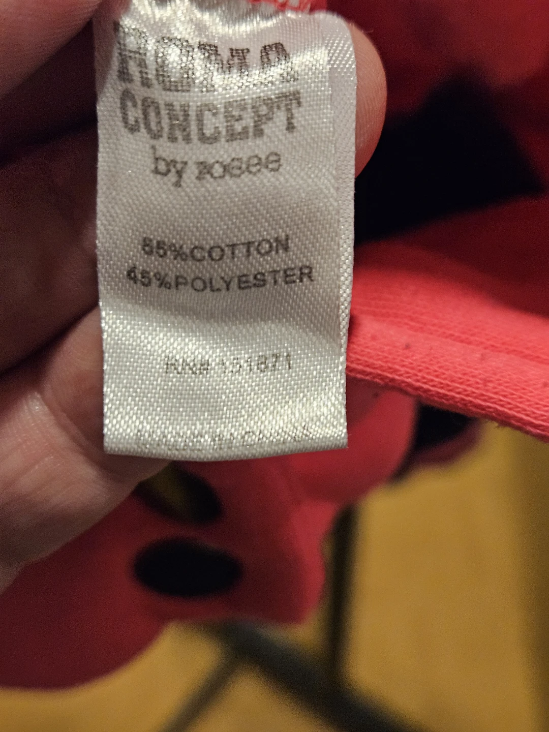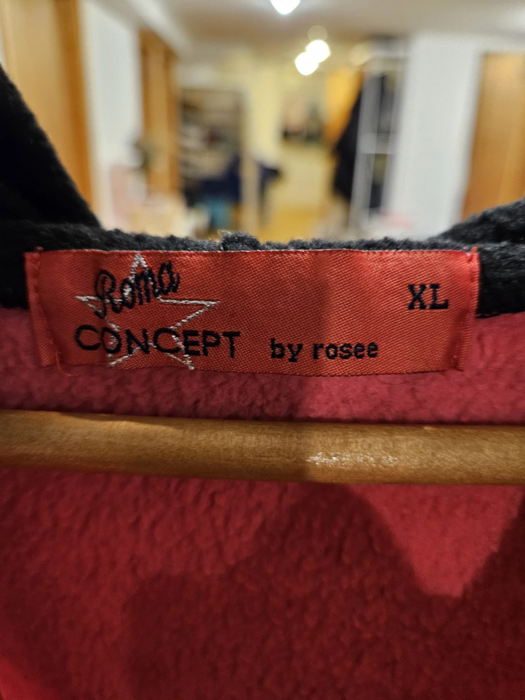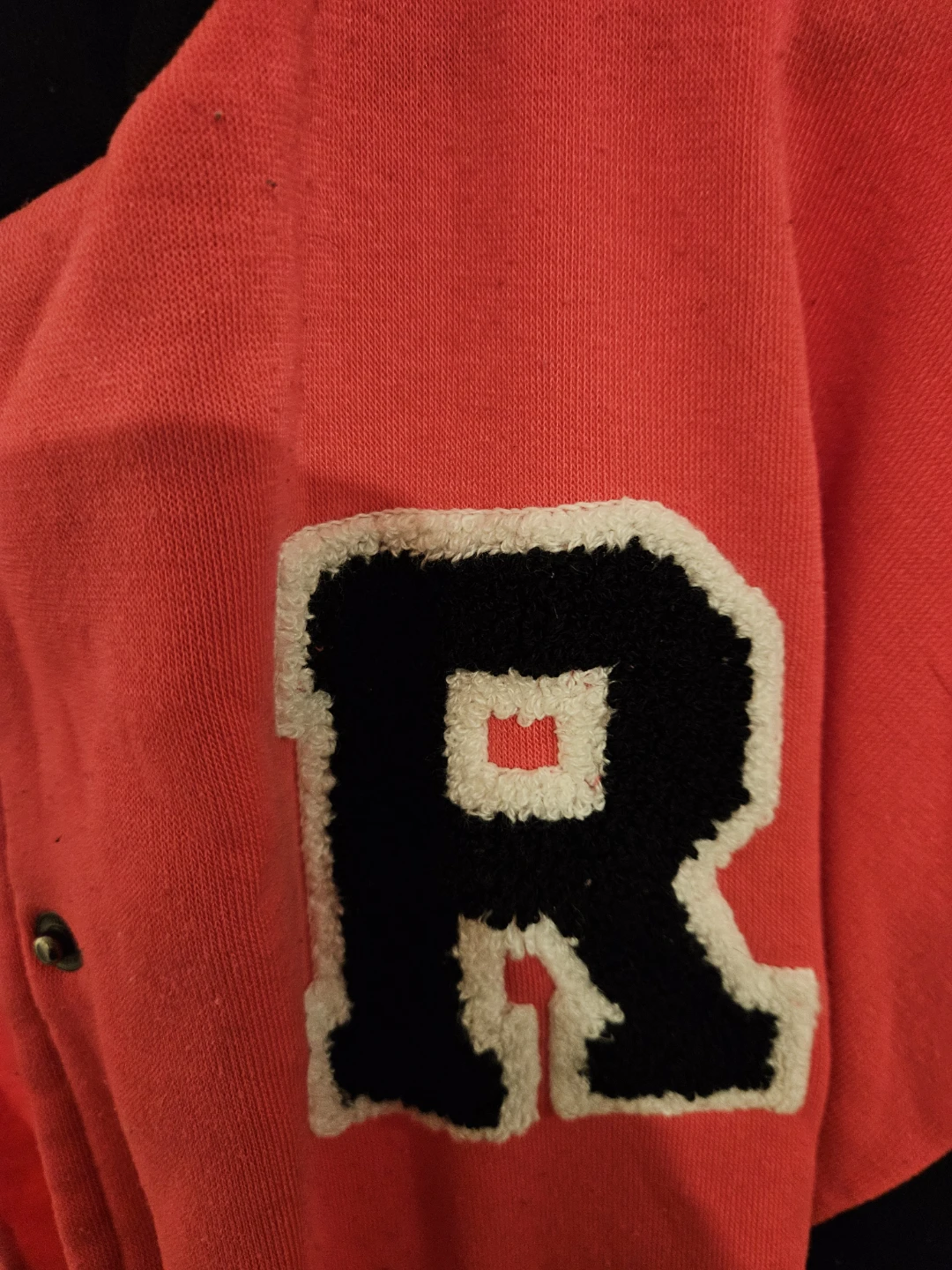 Roma Concept by Rosee varsity jacket. Features a pink body with black sleeves and hood. Includes a chenille "R" patch on the chest and snap button closure. Made of 55% Cotton and 45% Polyester. Size XL.