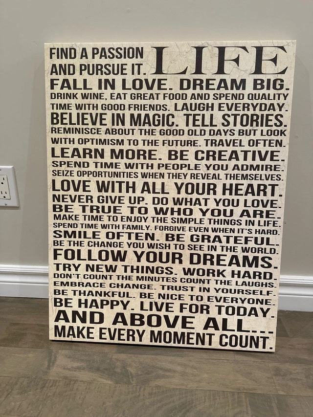 Add a touch of inspiration to any room with this used canvas art piece, featuring motivational quotes and sayings about life, love, and happiness. It's in good condition and ready to uplift your space! I'm thinking of pricing it at $25 since similar wall decor sells in the $20-$30 range on Kijiji. If you're seeing it, it's still available. Don't miss out on bringing a little extra joy into your home.