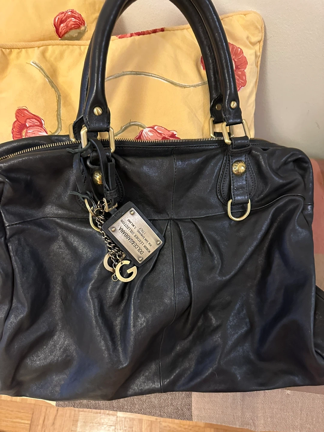 This is a DOLCE & GABBANA woman's handbag(travel bag)from the "Woman Leather Collection." It's made of black leather. The bag comes with a detachable shoulder strap.