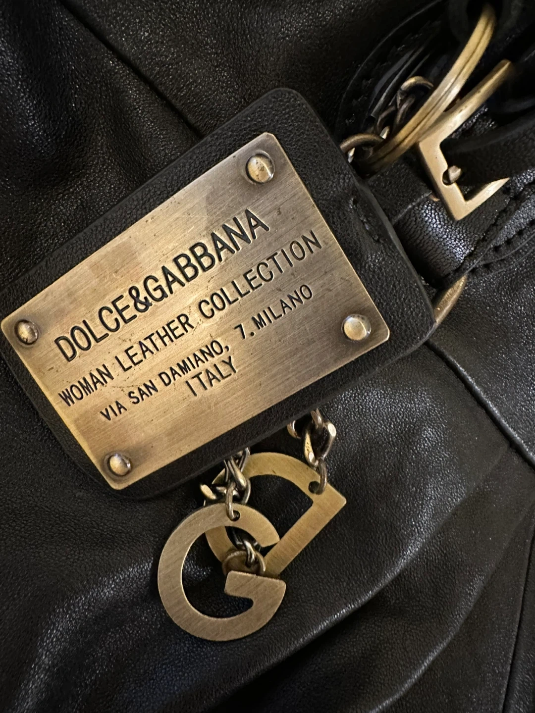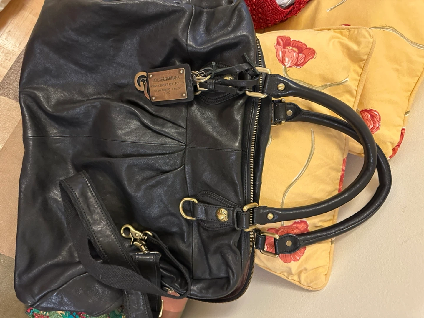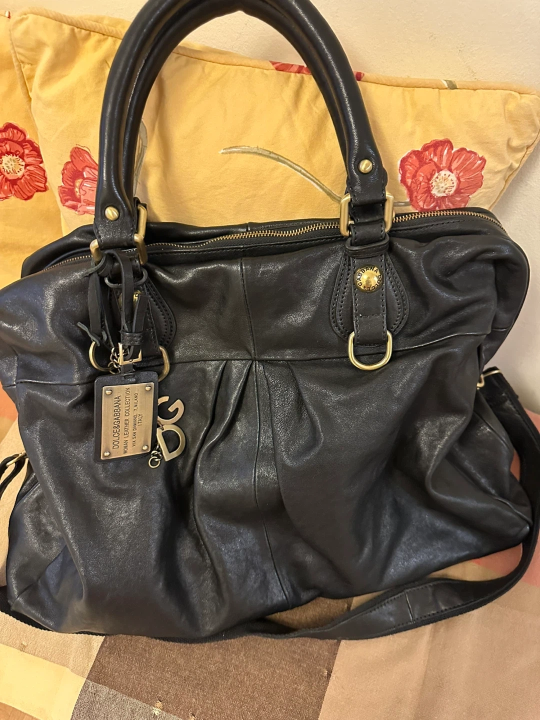 This is a DOLCE & GABBANA woman's handbag(travel bag)from the "Woman Leather Collection." It's made of black leather. The bag comes with a detachable shoulder strap.