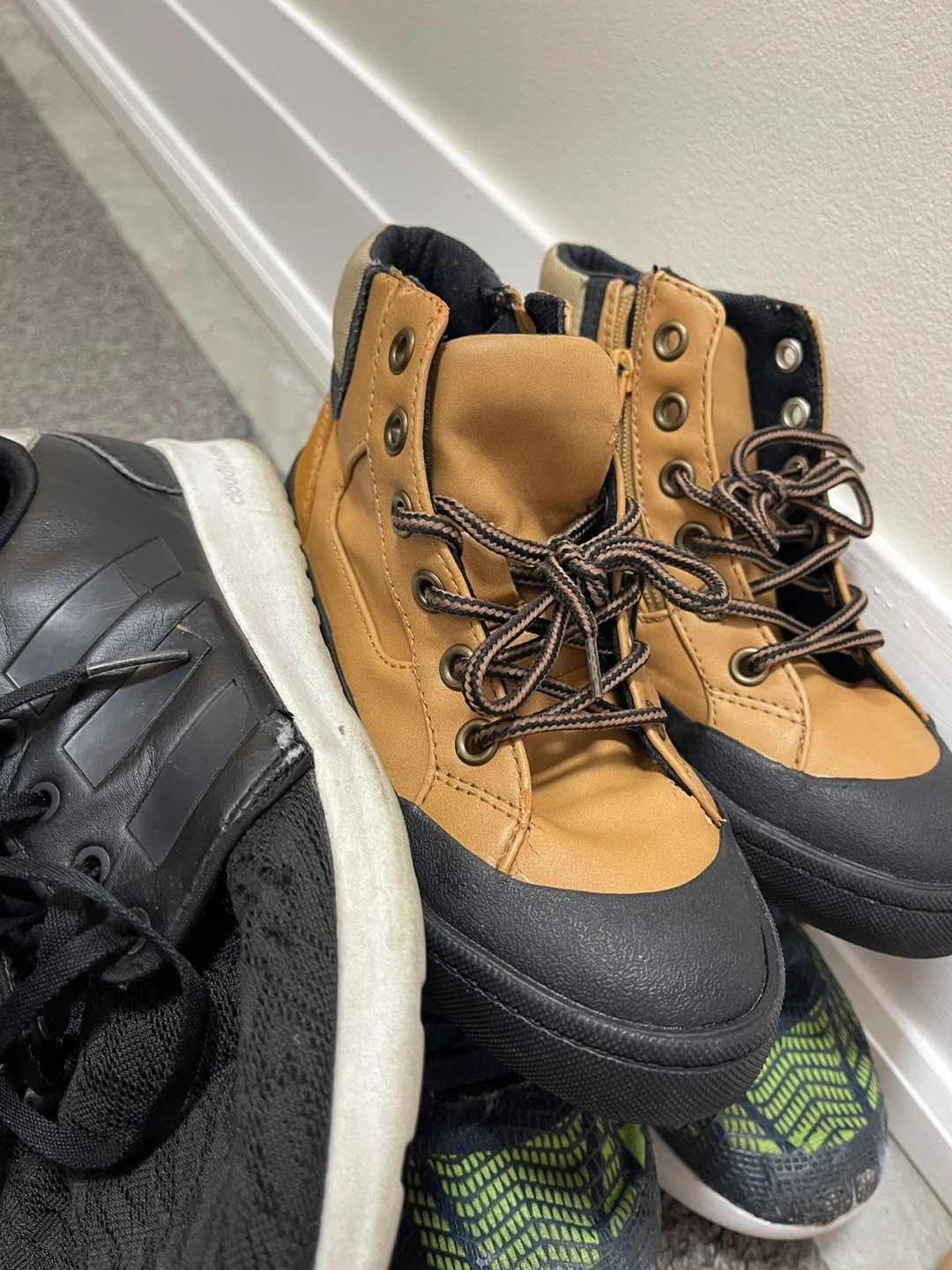 These are cute brown and black toddler boots. They feature laces and a side zipper for easy on and off. The durable rubber sole offers good traction for little feet.