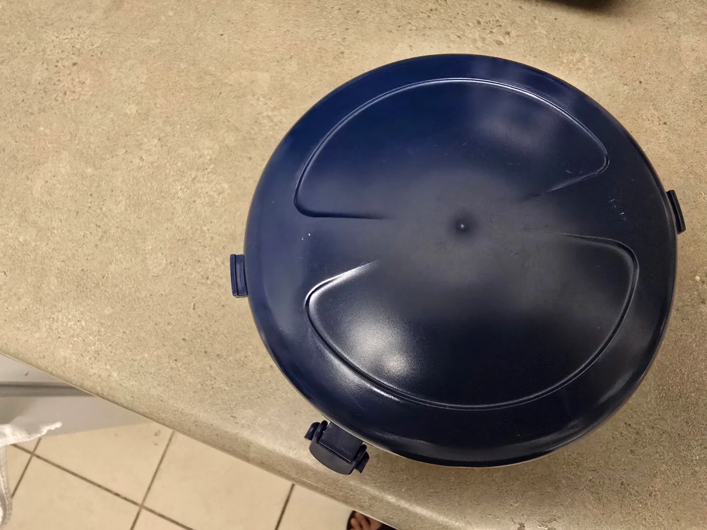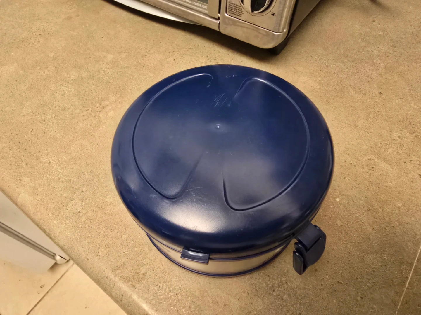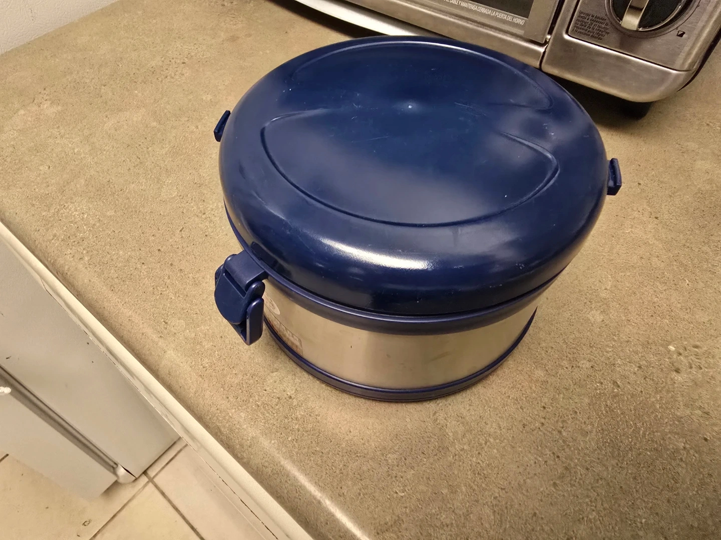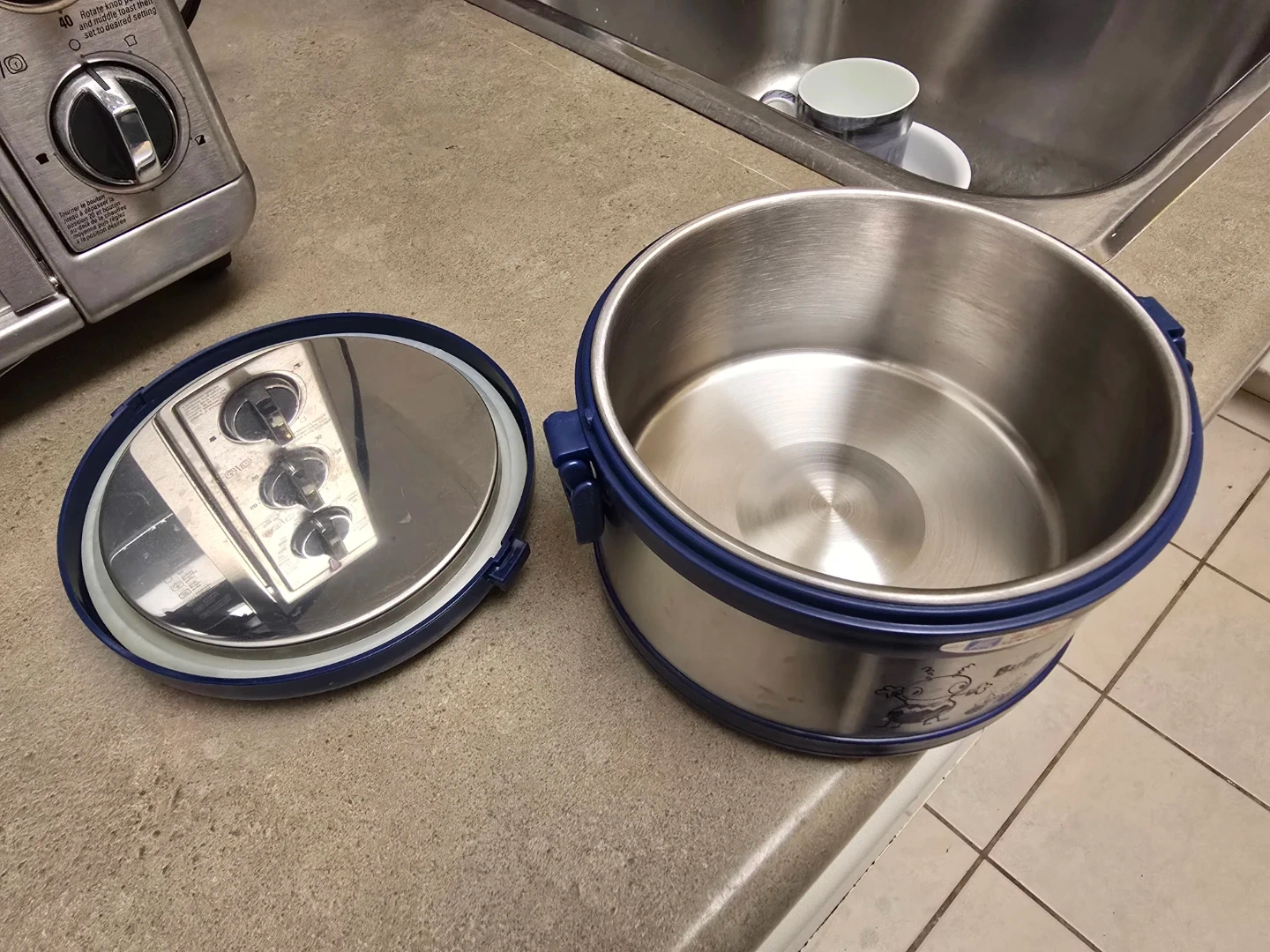 This is a blue and silver BuBee Fat Ants lunch container. It's made of stainless steel with a plastic lid and blue accents. The container is round and comes with a separate lid.
