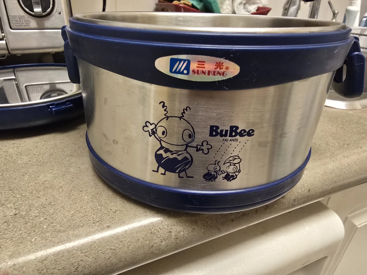 This is a blue and silver BuBee Fat Ants lunch container. It's made of stainless steel with a plastic lid and blue accents. The container is round and comes with a separate lid.