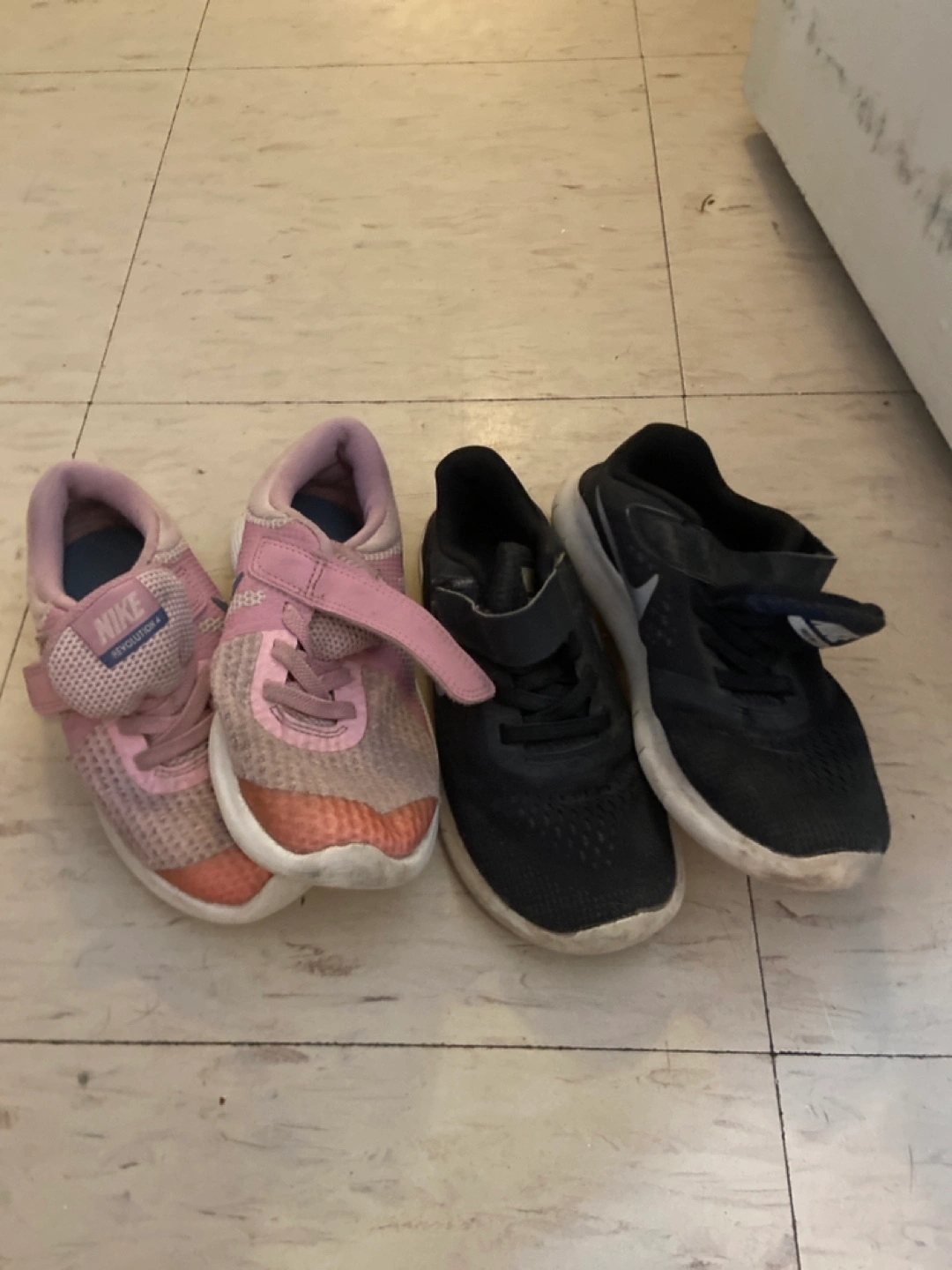Two pairs of lightly used children's running shoes. Size 12 c Pink and black. Velcro closures. Great for active kids. $5 for both pairs