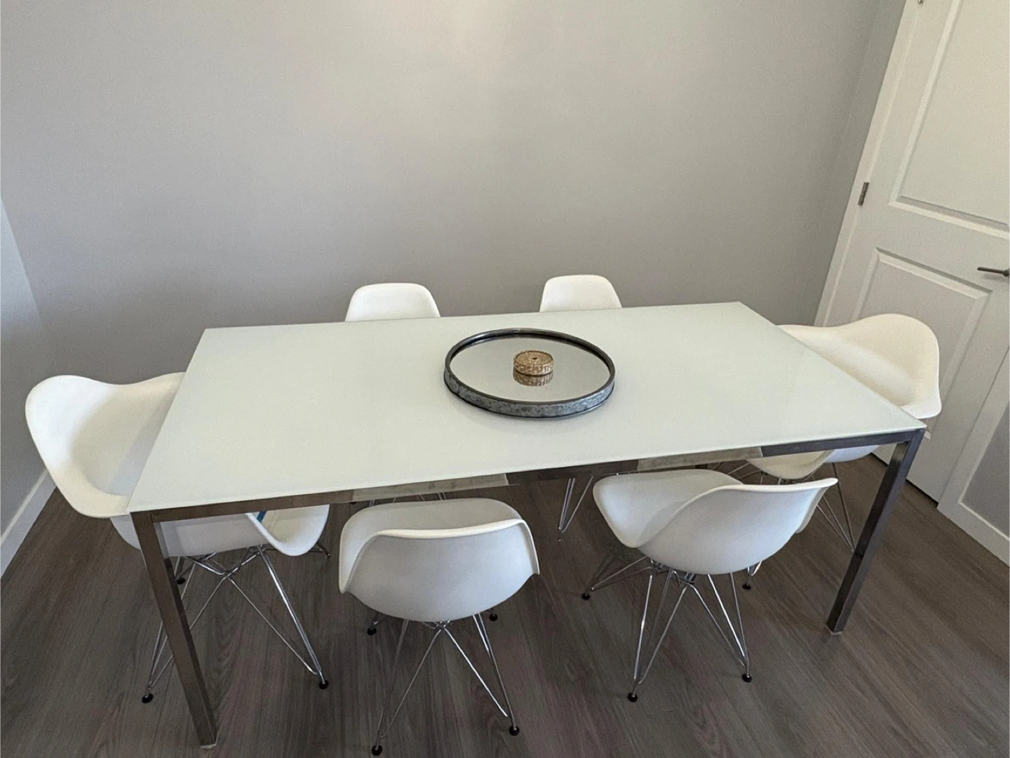 Selling a dining table with six white chairs! The table features a sleek, modern design with a white top and chrome legs. The chairs are white and have a unique, comfortable shape.