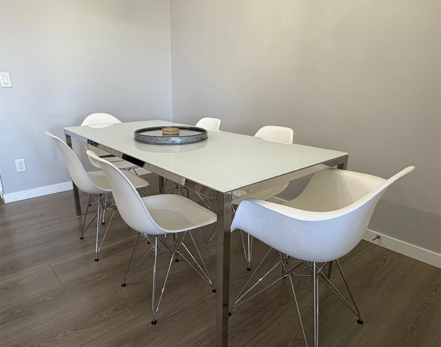 Selling a dining table with six white chairs! The table features a sleek, modern design with a white top and chrome legs. The chairs are white and have a unique, comfortable shape.