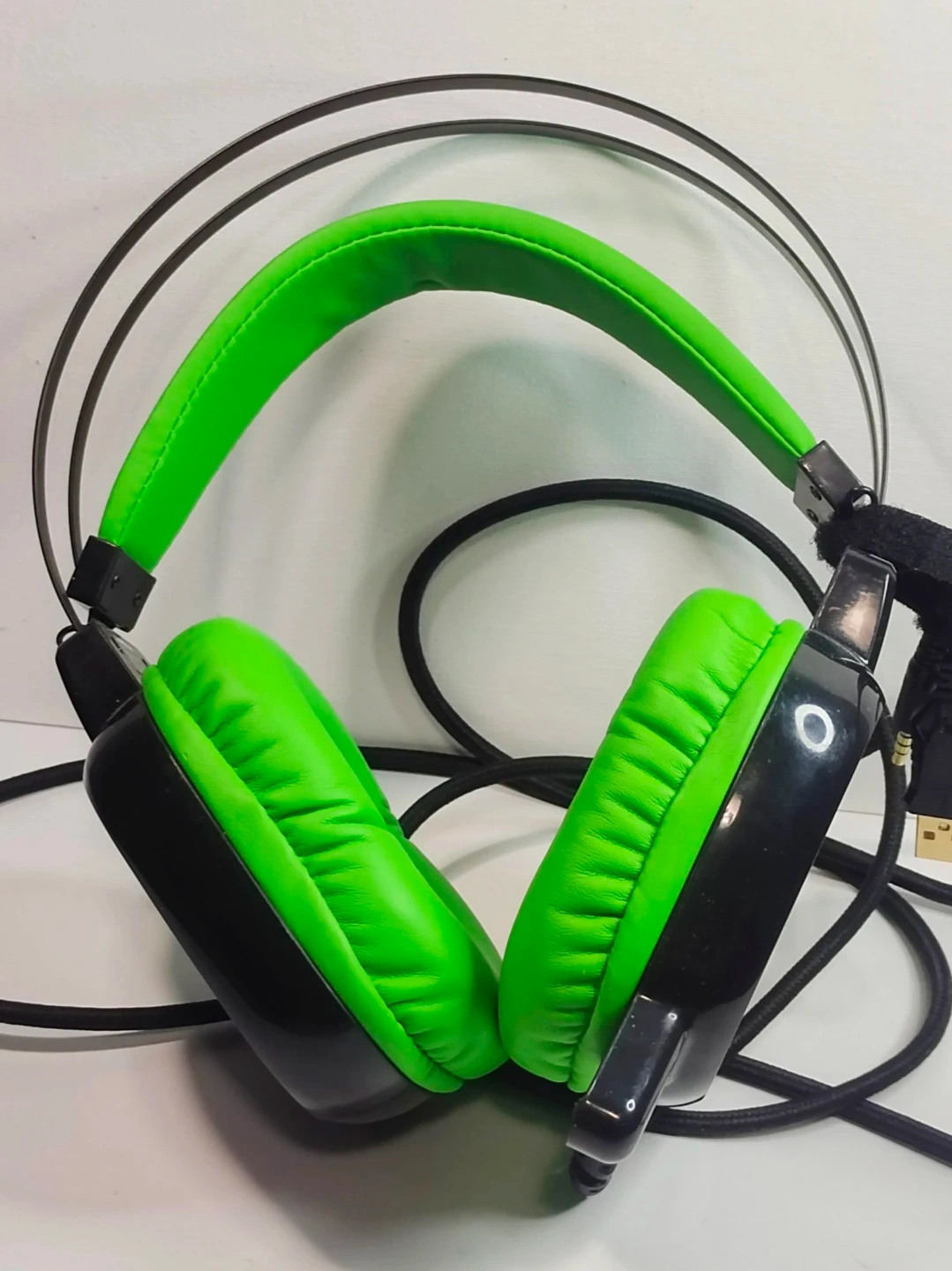 These black and green SoundLogic XT headphones are designed for gaming. They feature padded earcups for comfort during long sessions. The adjustable headband ensures a good fit for different users.