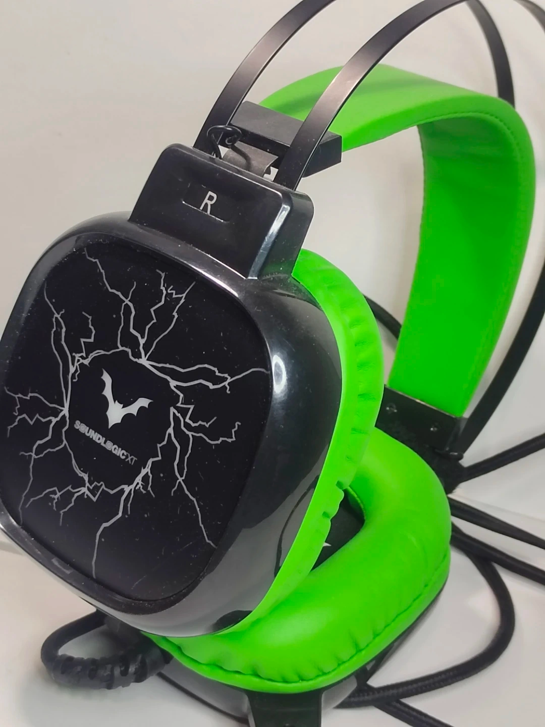 These black and green SoundLogic XT headphones are designed for gaming. They feature padded earcups for comfort during long sessions. The adjustable headband ensures a good fit for different users.