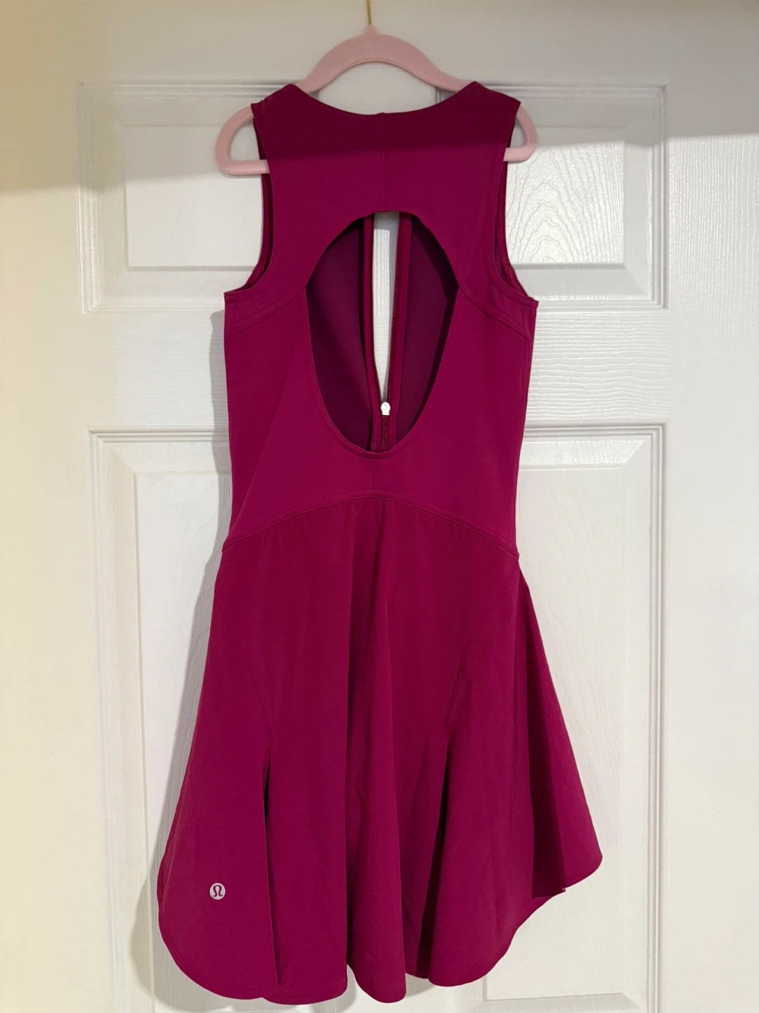 This Lululemon tennis dress is a vibrant magenta colour and features built-in shorts. It has a full zipper down the front and a cut-out detail at the back. Perfect for hitting the courts!