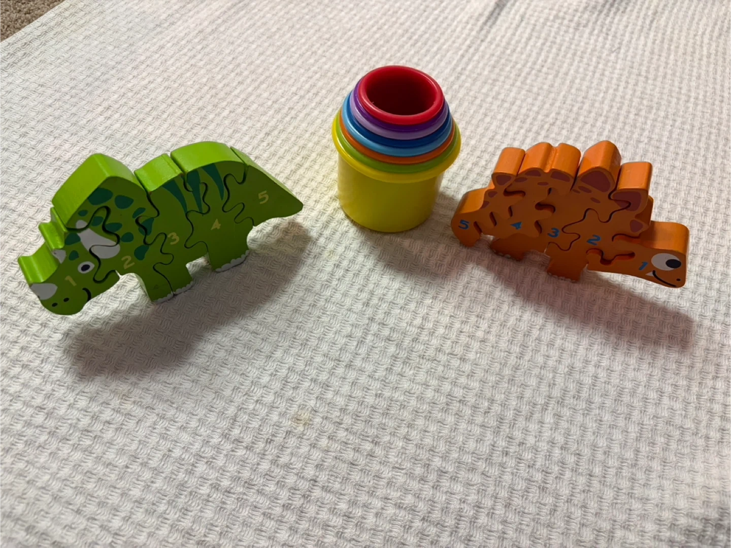 This set includes two wooden dinosaur puzzles, each numbered 1-5. It also comes with a set of colourful stacking cups. Great for little ones learning numbers and shapes!