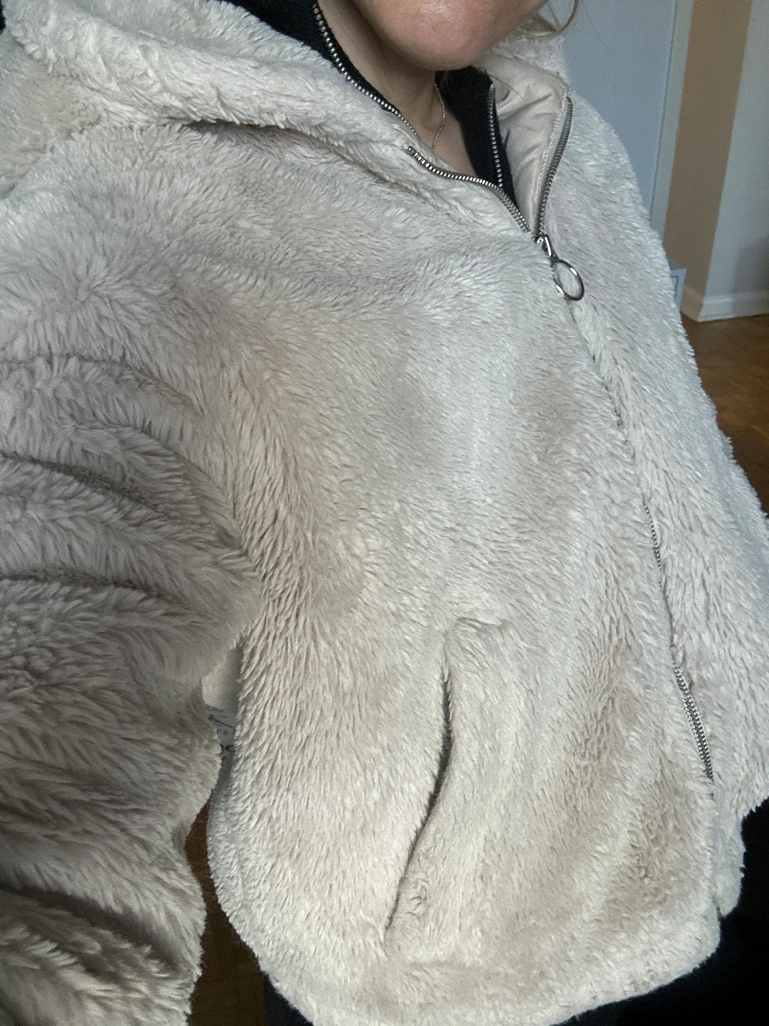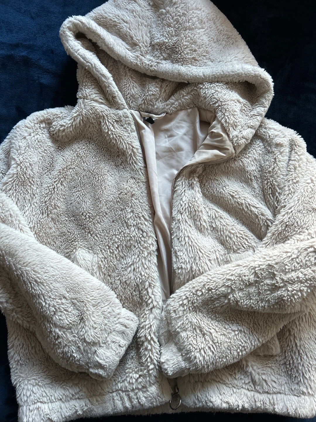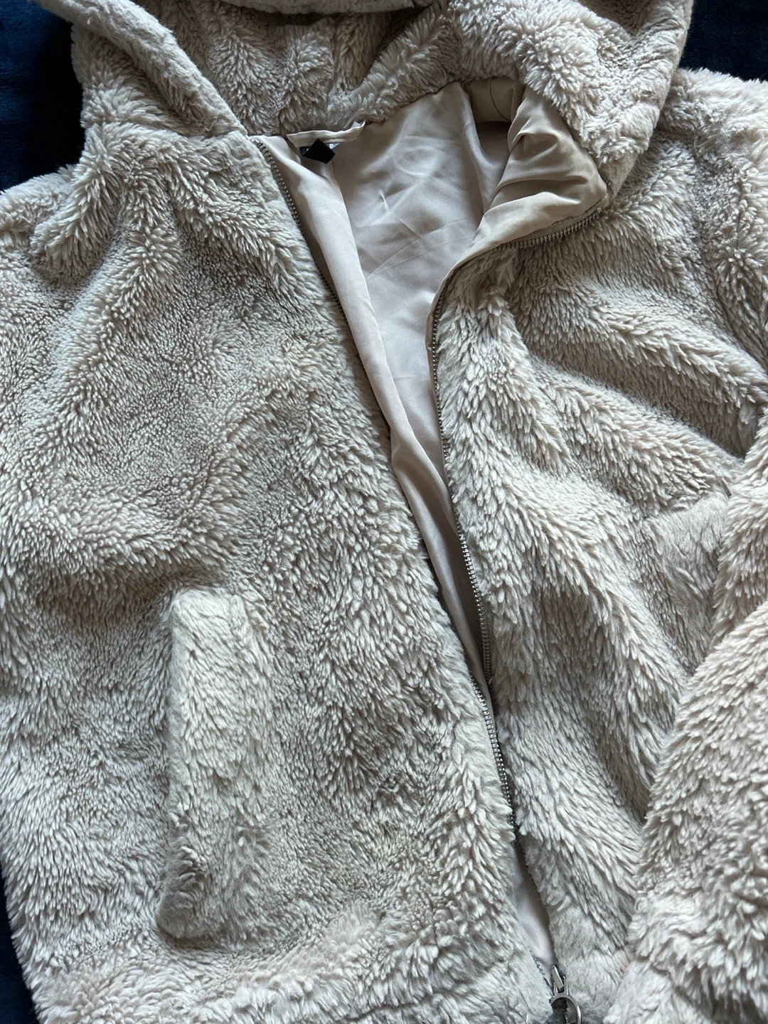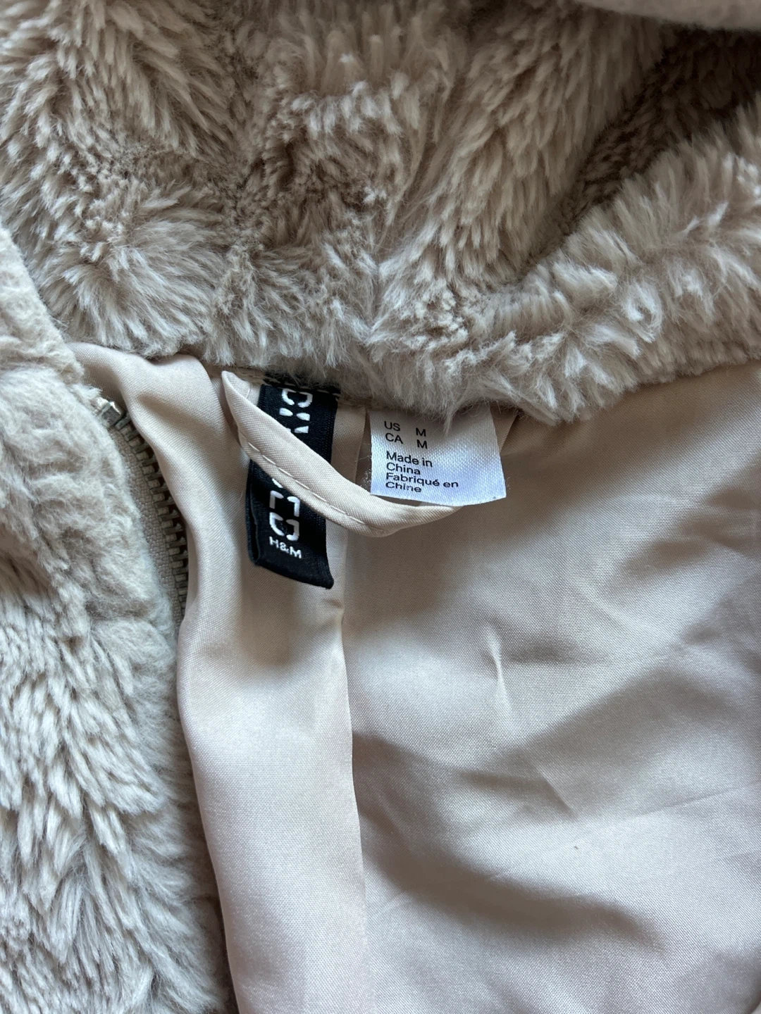 Cozy up in this H&M fuzzy hooded jacket! It's a size medium and features a soft, cream-coloured exterior that's perfect for chilly days. The jacket is in great condition, selling everything