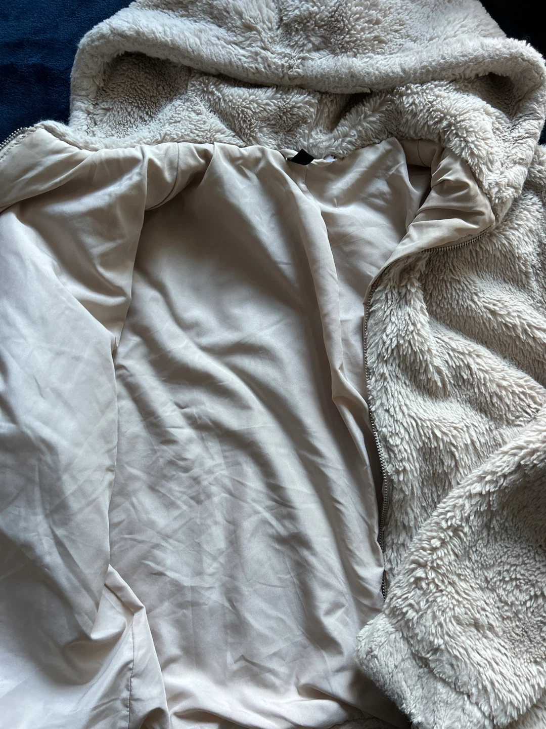 Cozy up in this H&M fuzzy hooded jacket! It's a size medium and features a soft, cream-coloured exterior that's perfect for chilly days. The jacket is in great condition, selling everything