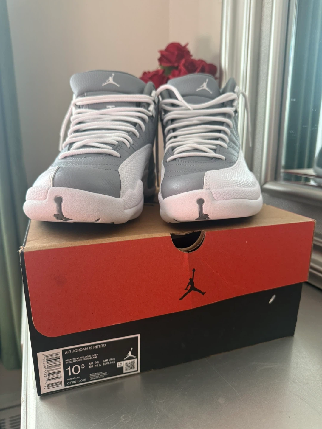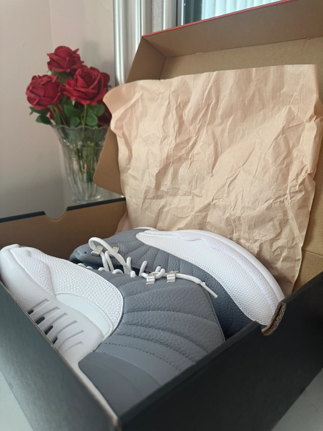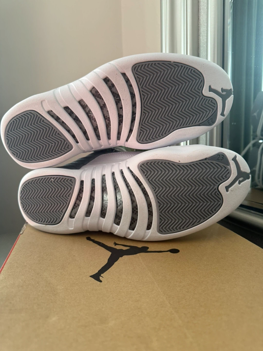 Classic Air Jordan 12 silhouette in the clean Stealth / White / Cool Grey colorway. Premium leather upper, comfortable cushioning, and timeless design. Ideal for everyday wear or sneaker collectors.