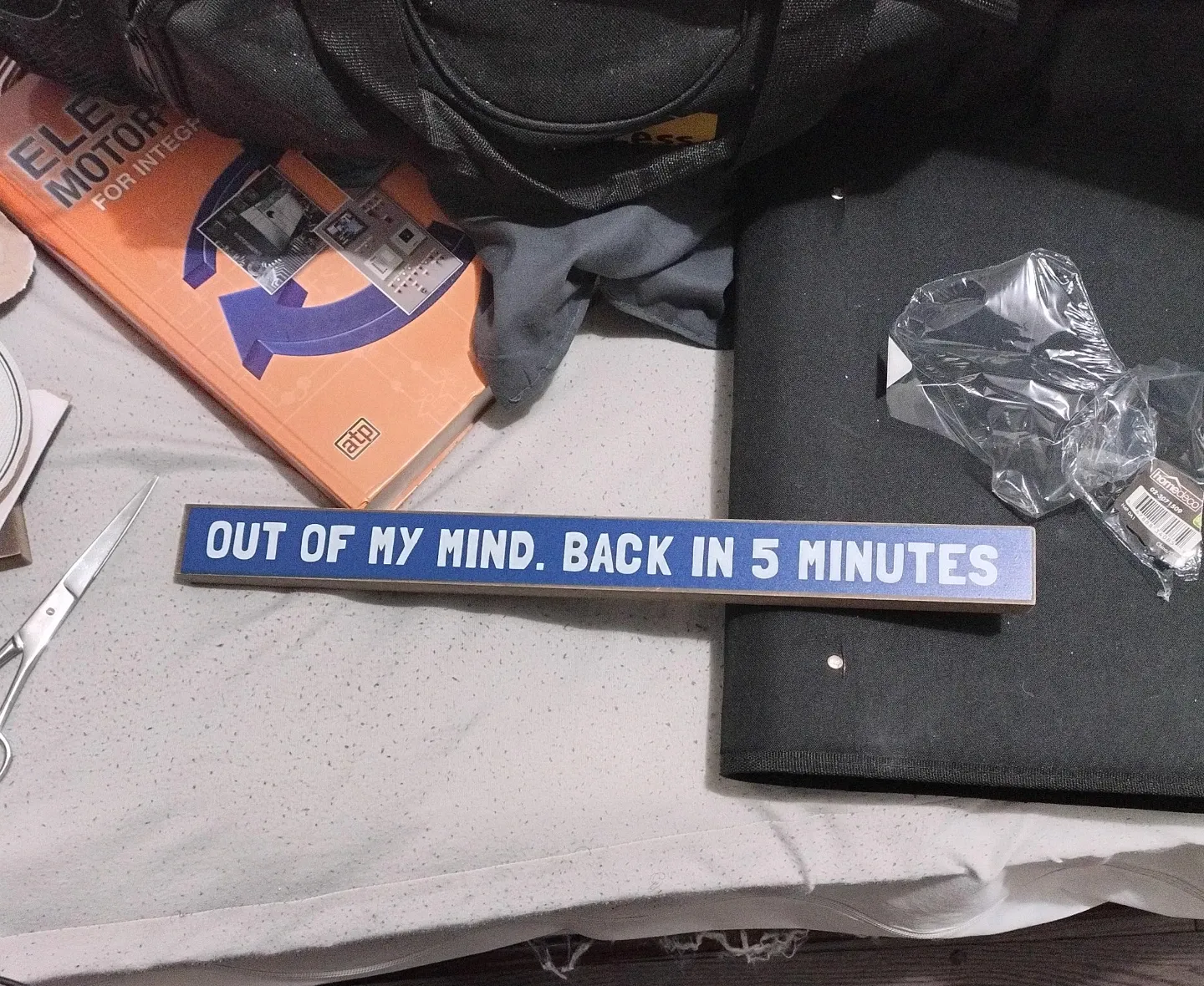 This wooden sign has a blue background with white lettering. It reads 'OUT OF MY MIND. BACK IN 5 MINUTES'. It's a fun piece for a home or office space! This would be great for anyone who needs a little chuckle.