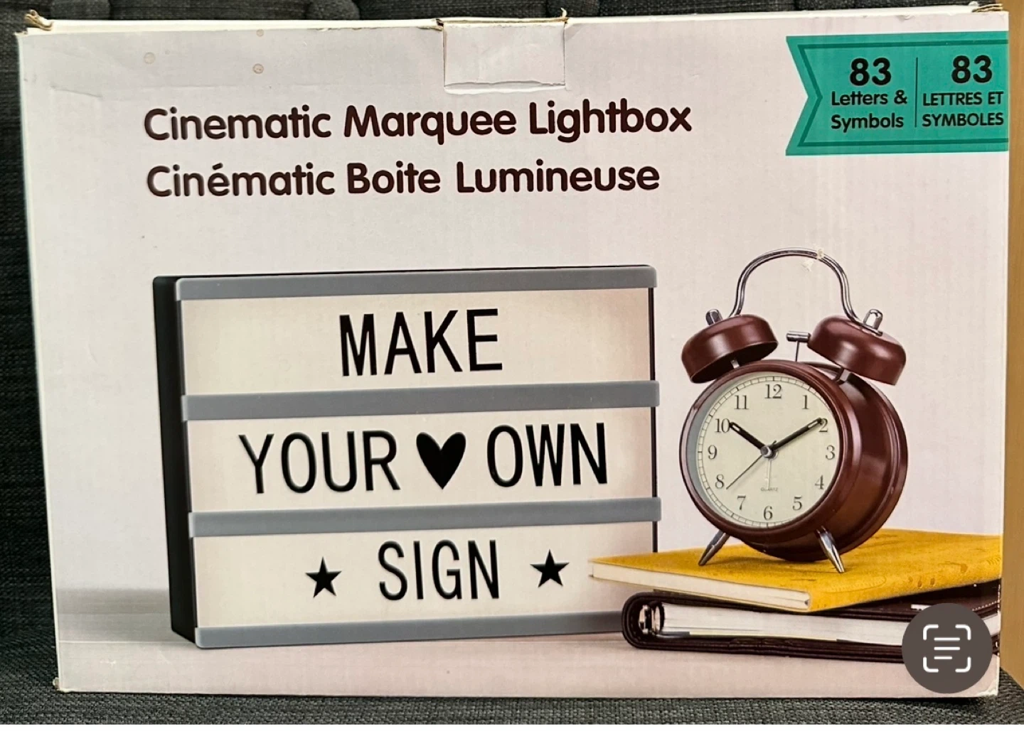 Get creative with this Cinematic Marquee Lightbox! It comes with 83 letters, numbers, symbols, and emojis so you can create your own custom phrase. It can stand alone or be conveniently mounted to the wall. It's powered by 6 x AA batteries (not included) or plugged into a USB port via cable. Box included!