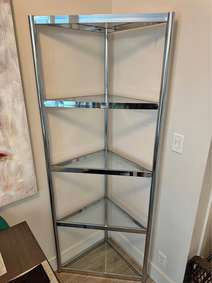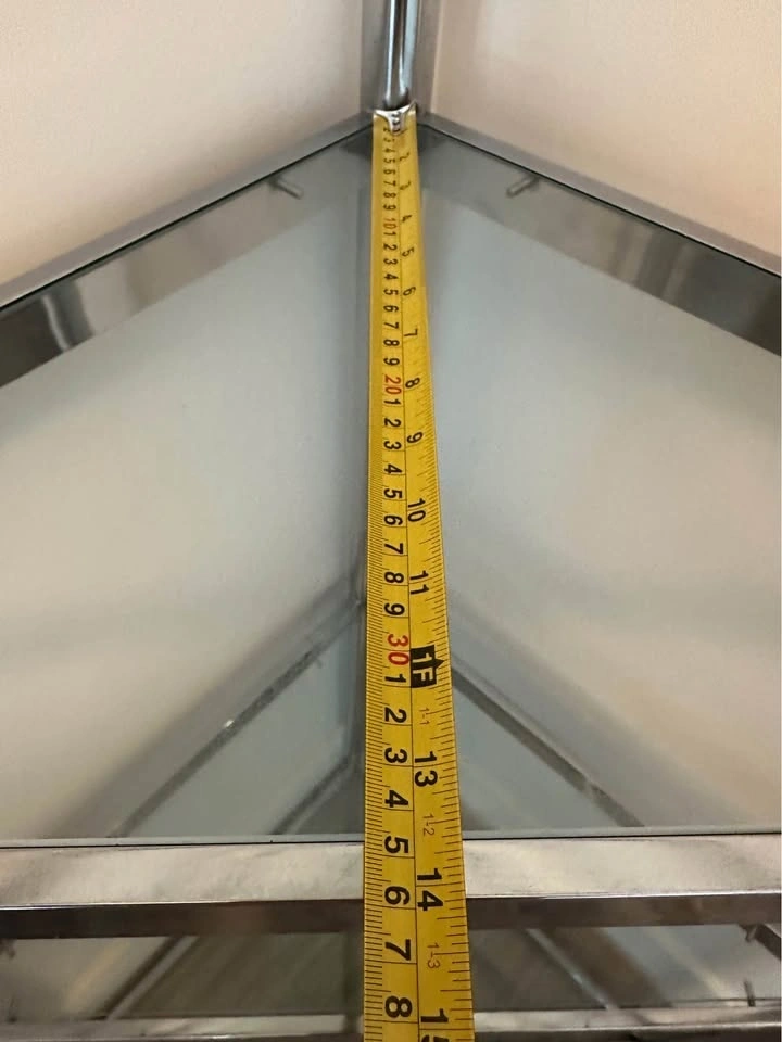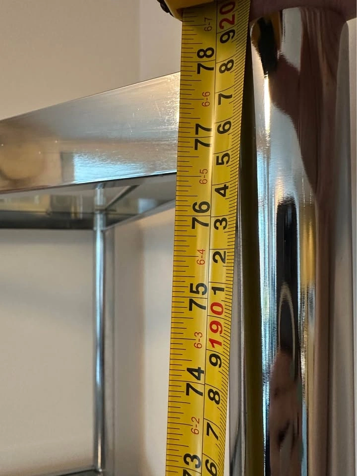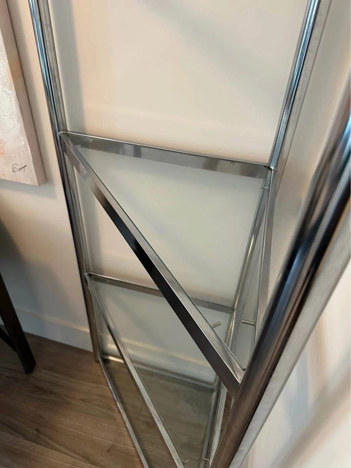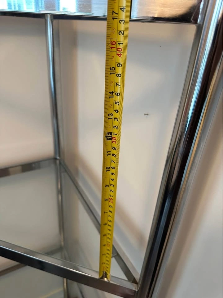 Great for home or business use. 78” tall x 31” wide x 14” deep with 17” space between each shelf. The glass shelves come off the metal frame, making it easy to clean. Pick up in Vicwest.