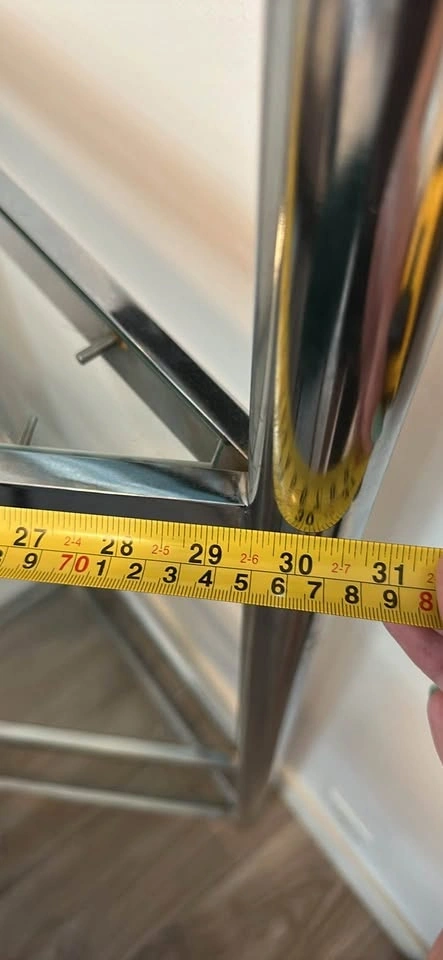 Great for home or business use. 78” tall x 31” wide x 14” deep with 17” space between each shelf. The glass shelves come off the metal frame, making it easy to clean. Pick up in Vicwest.