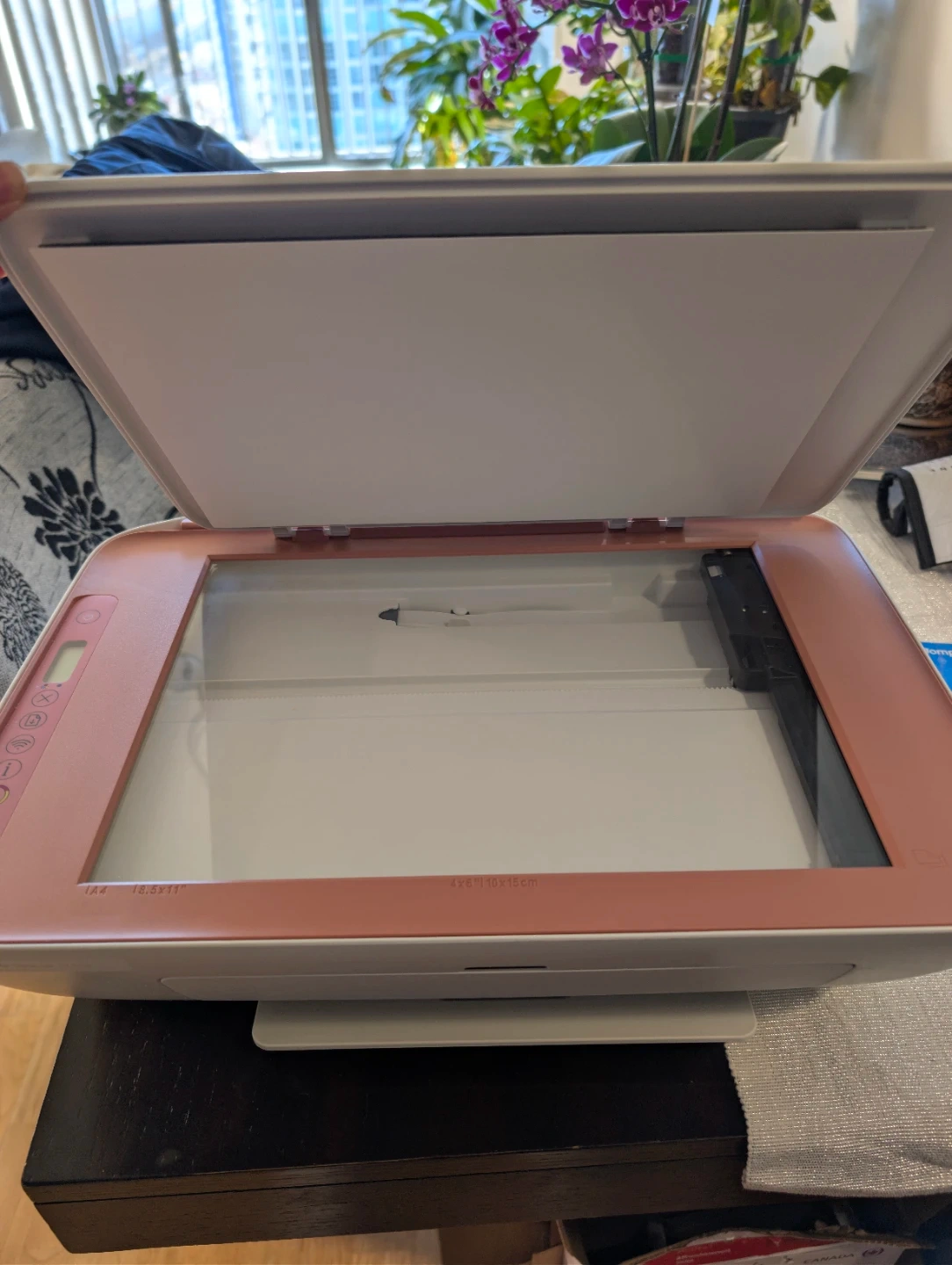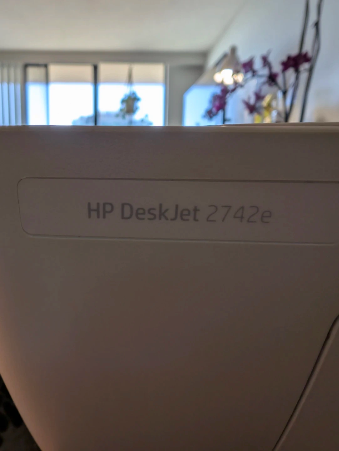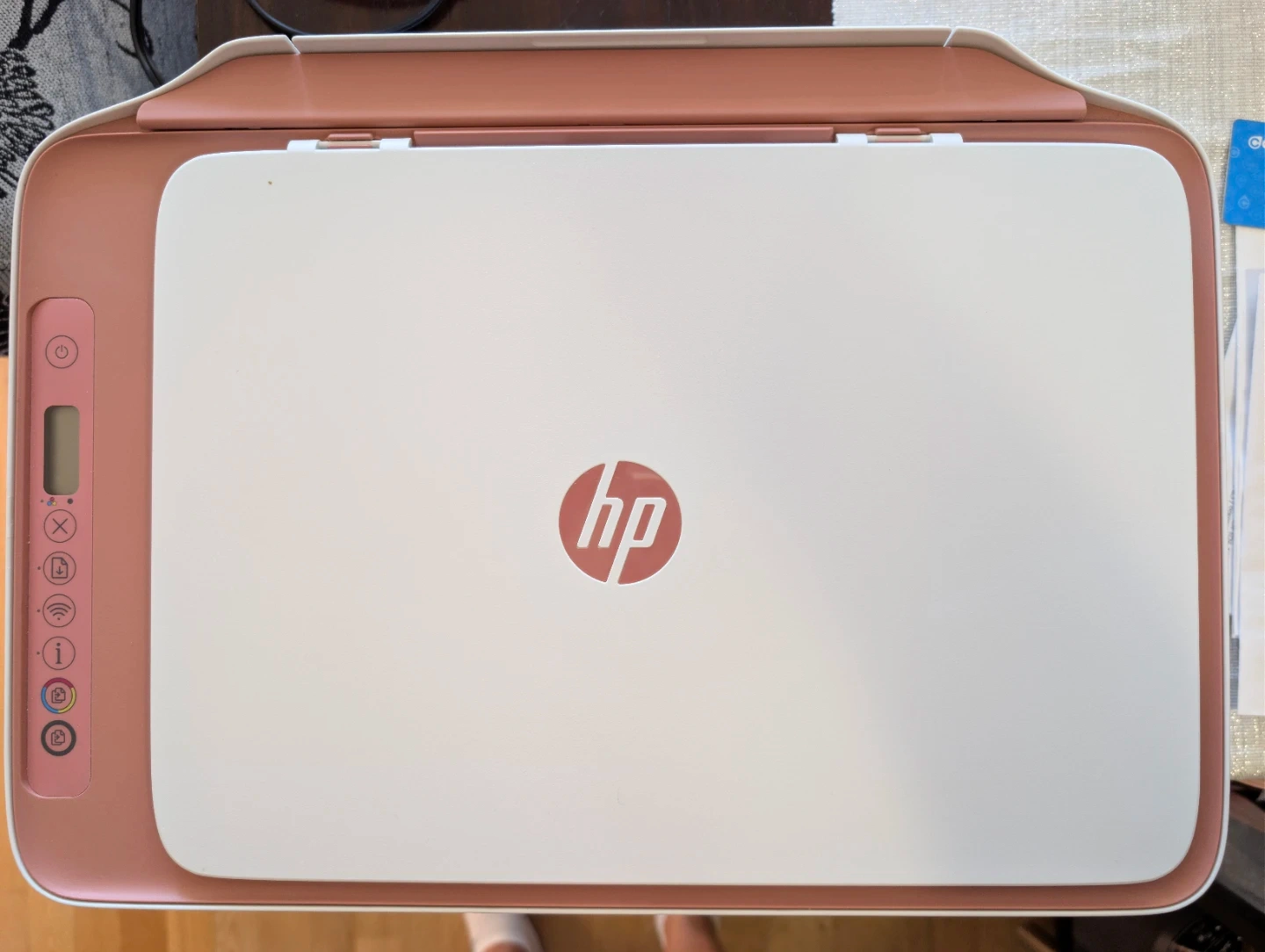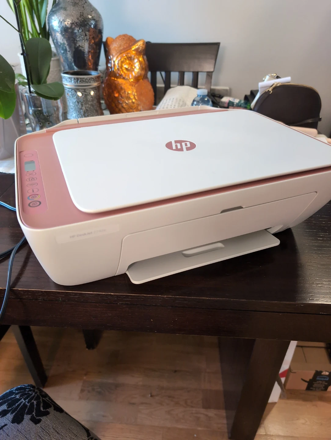 This HP DeskJet 2742e is a handy all-in-one printer that can print, scan, and copy. It's a compact machine, making it suitable for home or small office use. This printer is white with rose gold accents, adding a touch of style.
