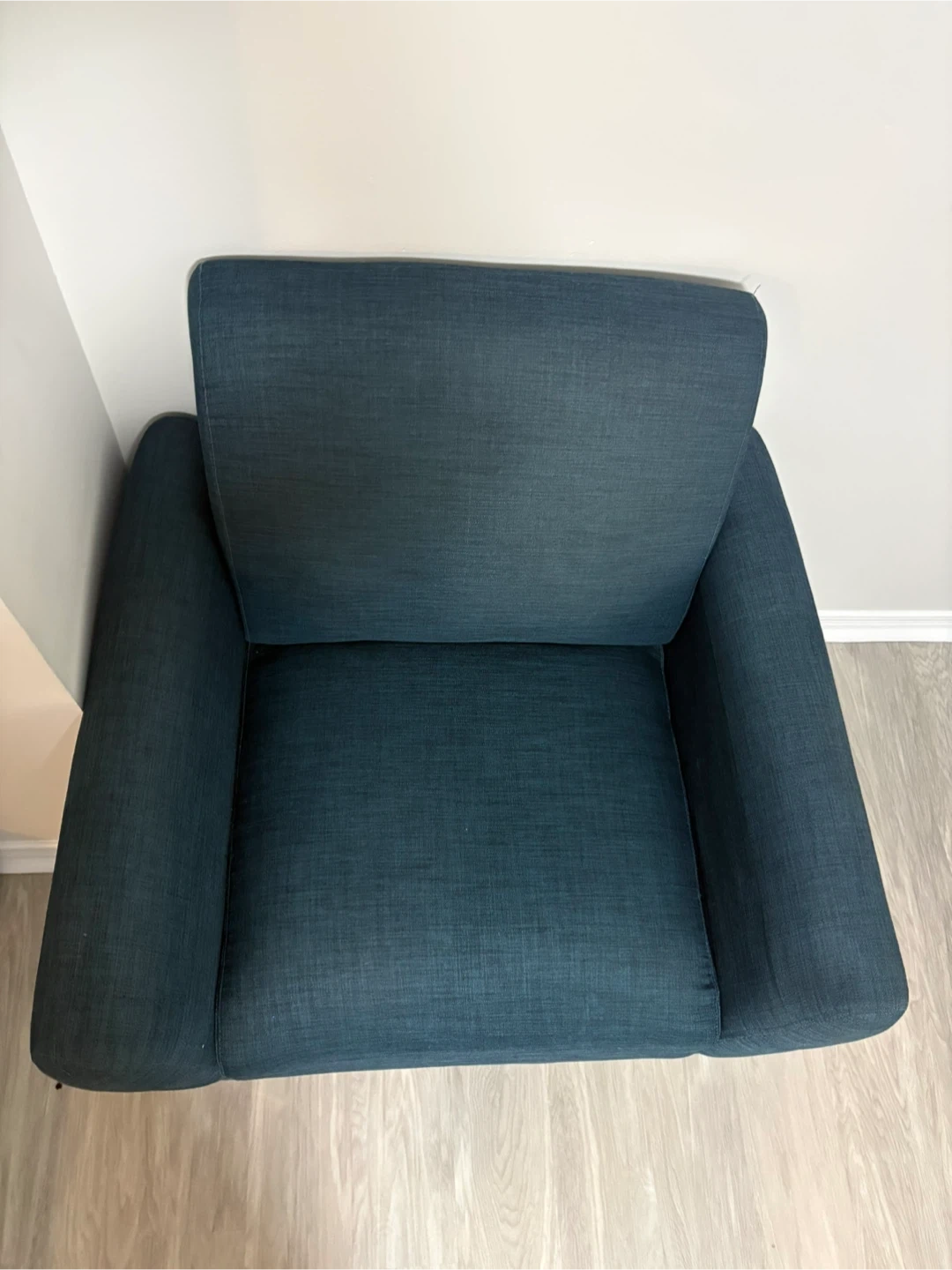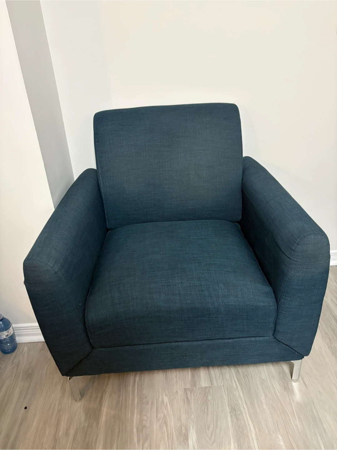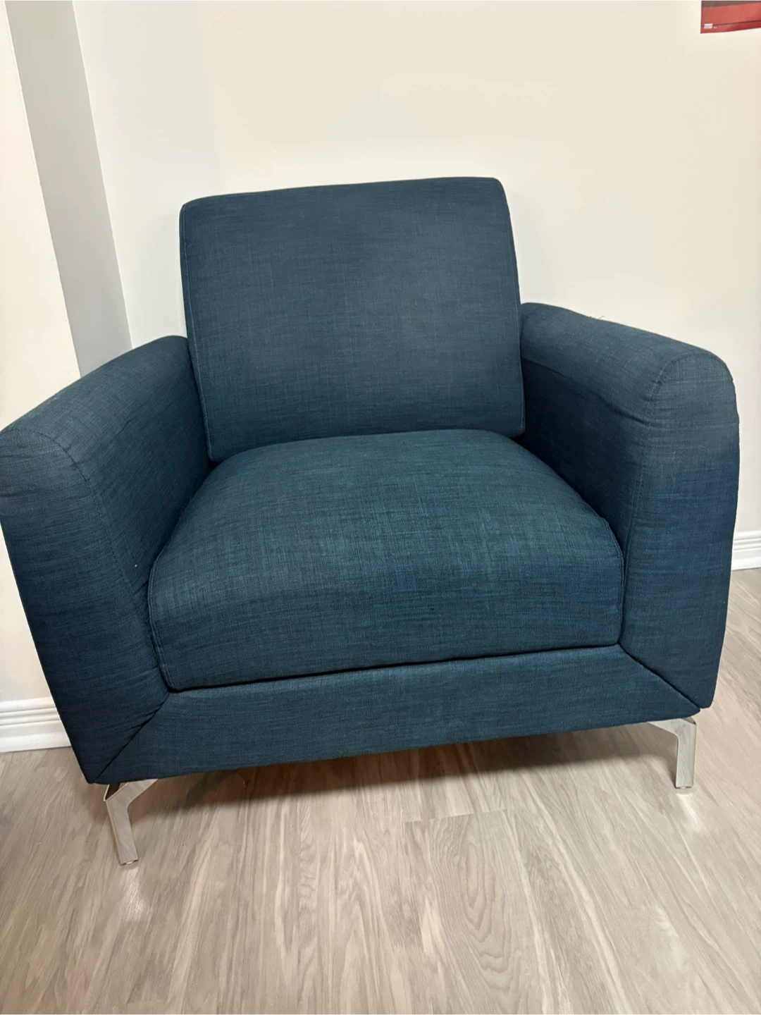Comfy armchair upholstered in a textured dark teal fabric. It features modern metal legs and a clean design. Perfect for adding a stylish seating option to any room.