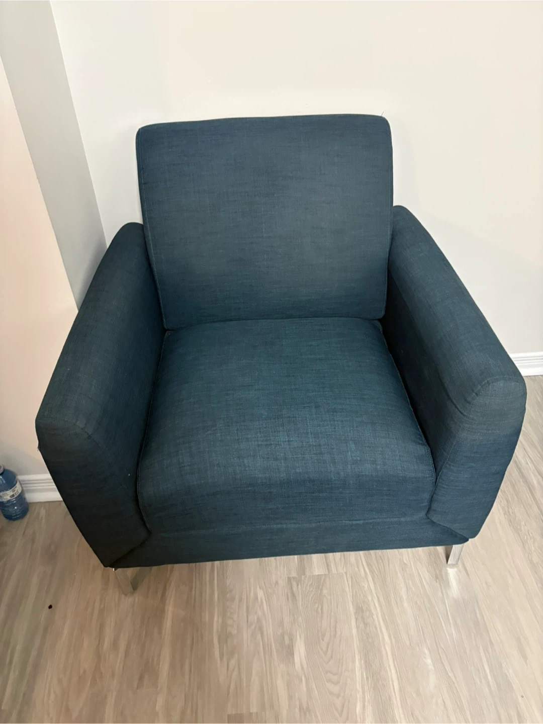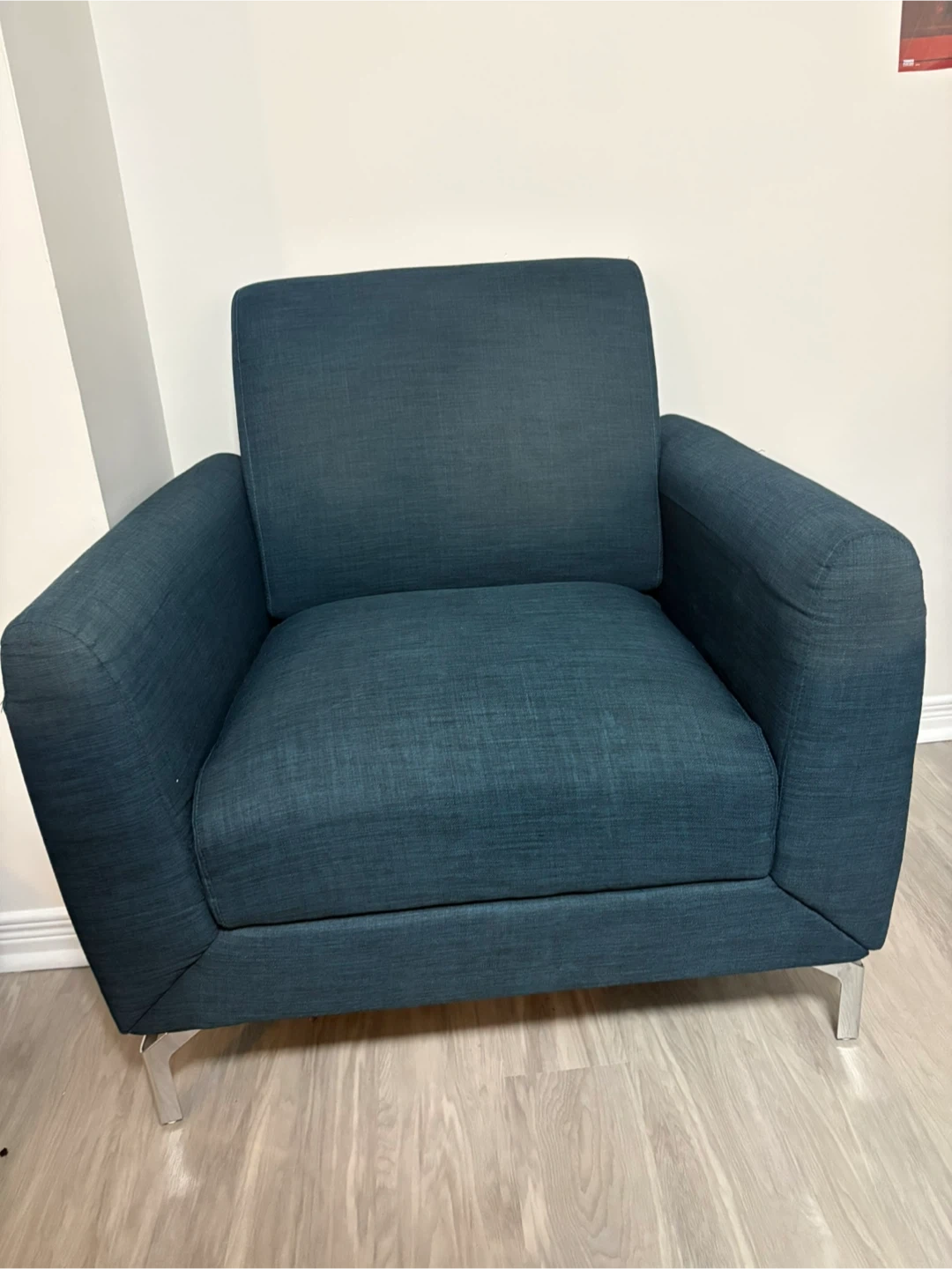 Comfy armchair upholstered in a textured dark teal fabric. It features modern metal legs and a clean design. Perfect for adding a stylish seating option to any room.