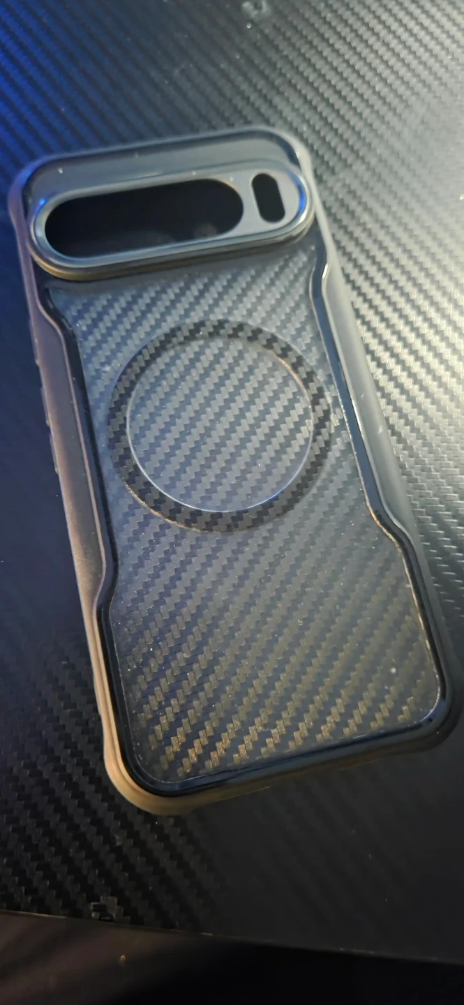 This is a phone case with a carbon fibre pattern. It's designed to be magnetic, likely for car mounts or chargers. The case has precise cutouts for the camera lens and flash. Pixel 9 pro xl