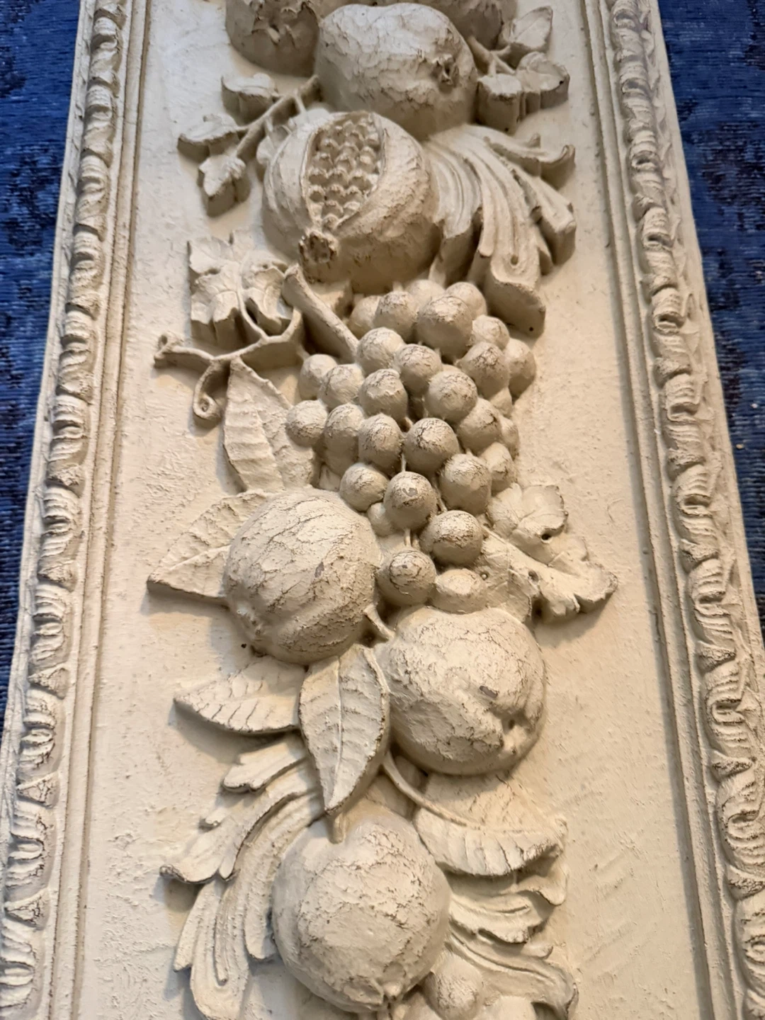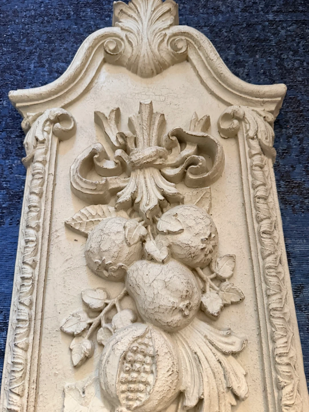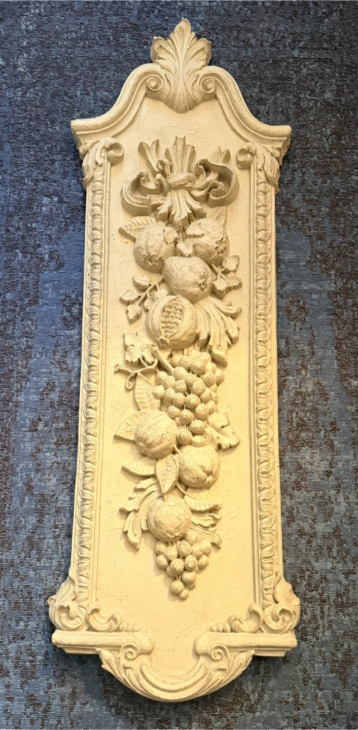 This decorative wall plaque features a cream-coloured, raised relief of a fruit garland, including grapes, pomegranates, and other fruits. It has a distressed finish adding to its vintage charm. It's suitable for adding a classical touch to any room.
