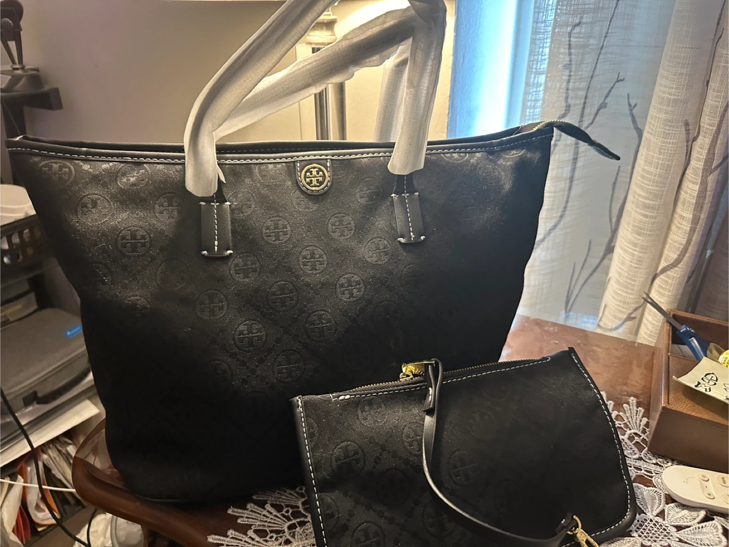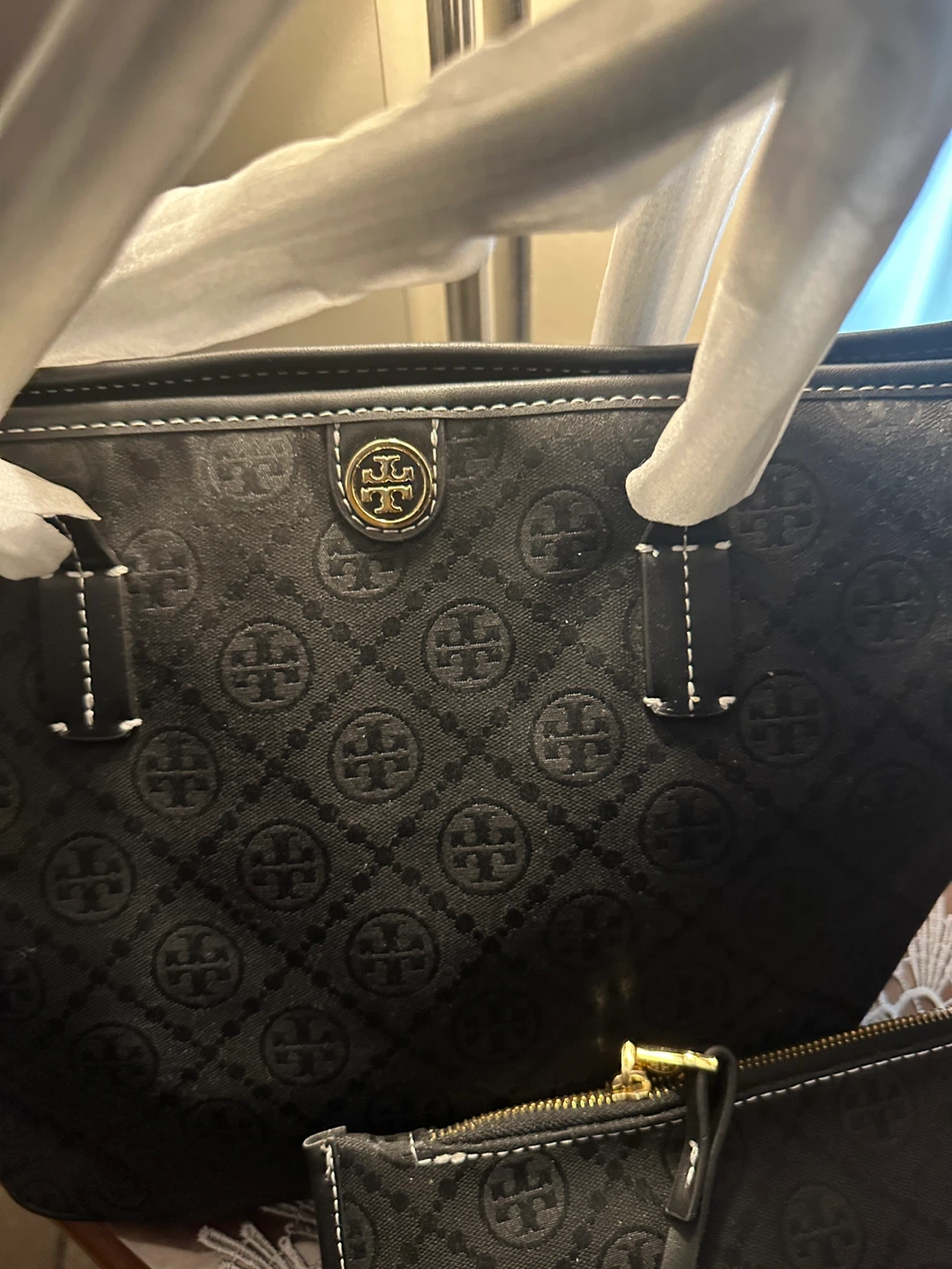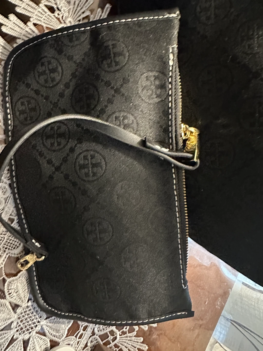This is a black Tory Burch tote bag with a matching pouch. It features the signature Tory Burch logo pattern embossed throughout. The tote has sturdy handles and a zipper closure. It's perfect for everyday use!