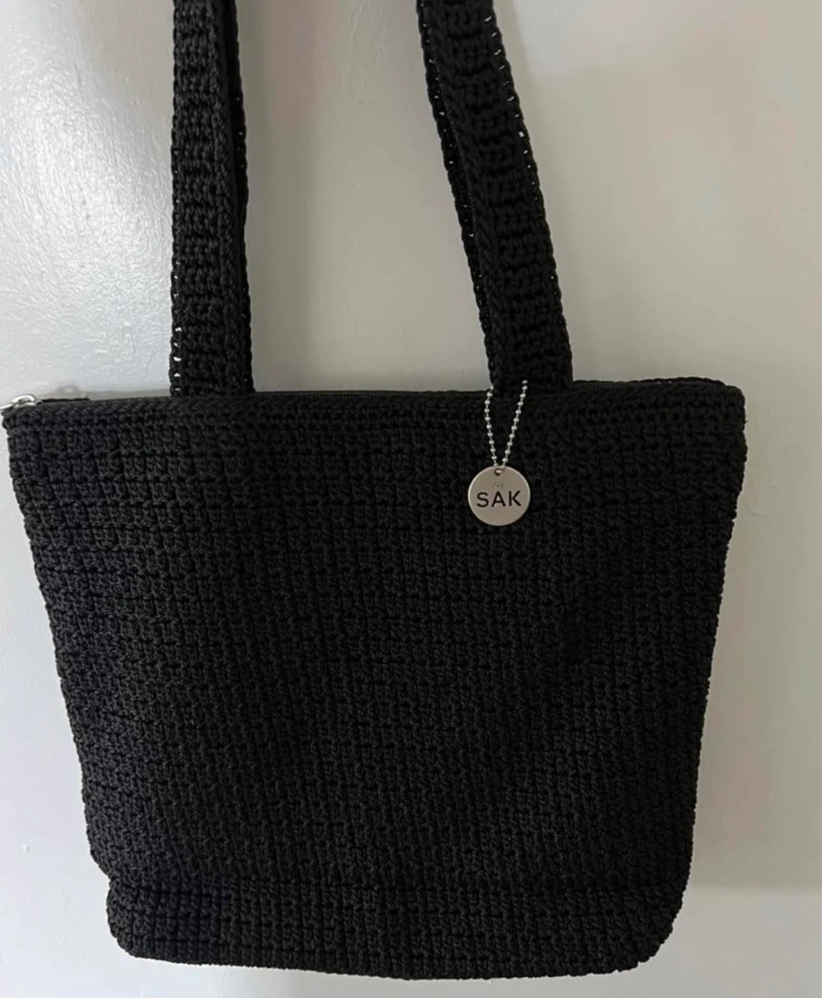 This is The SAK, a black crocheted tote bag/purse. It features a zipper closure and a dangling charm with the SAK logo. The crochet material gives it a unique texture.
