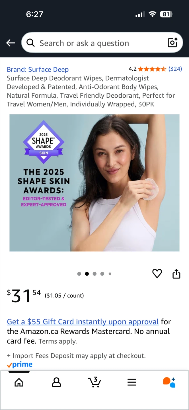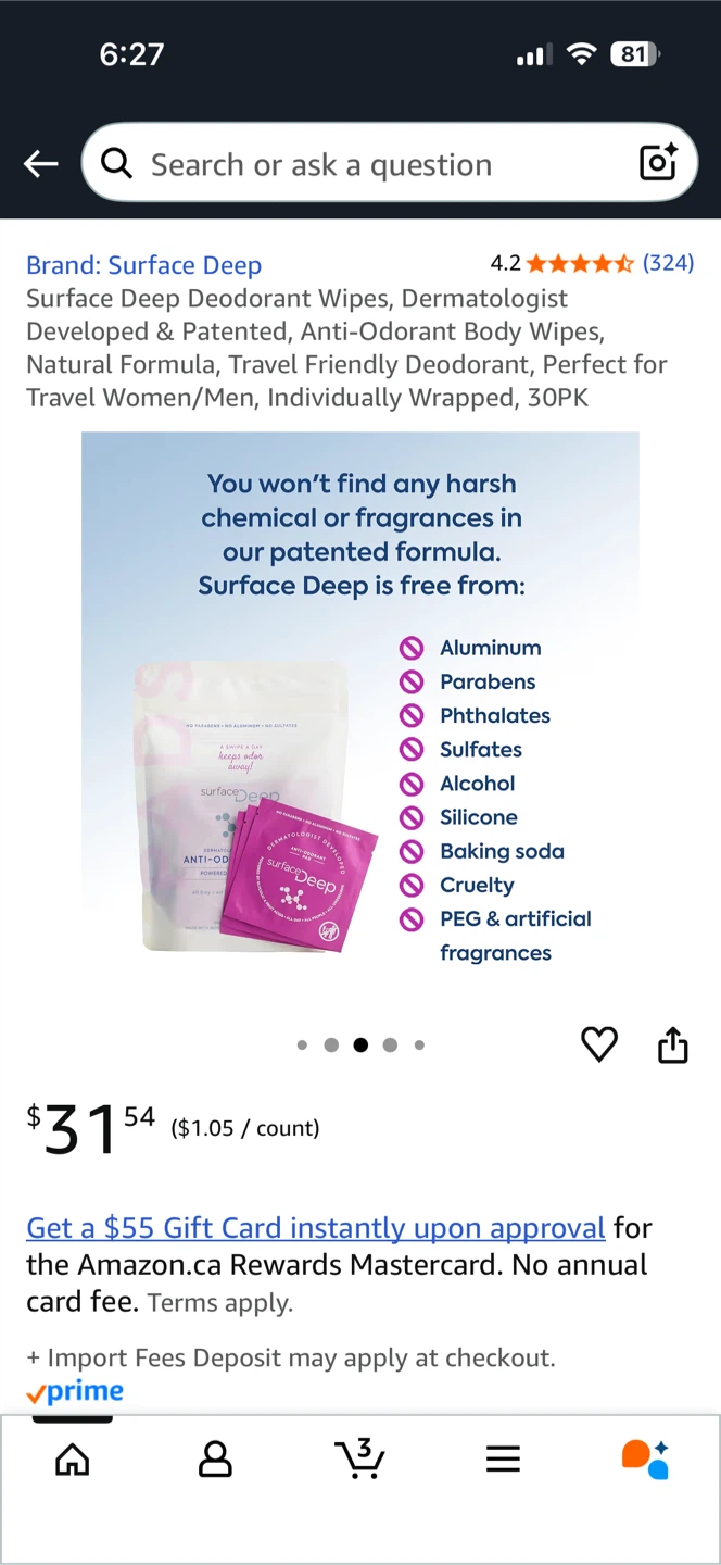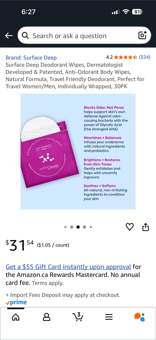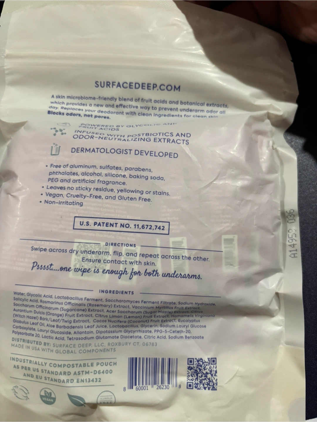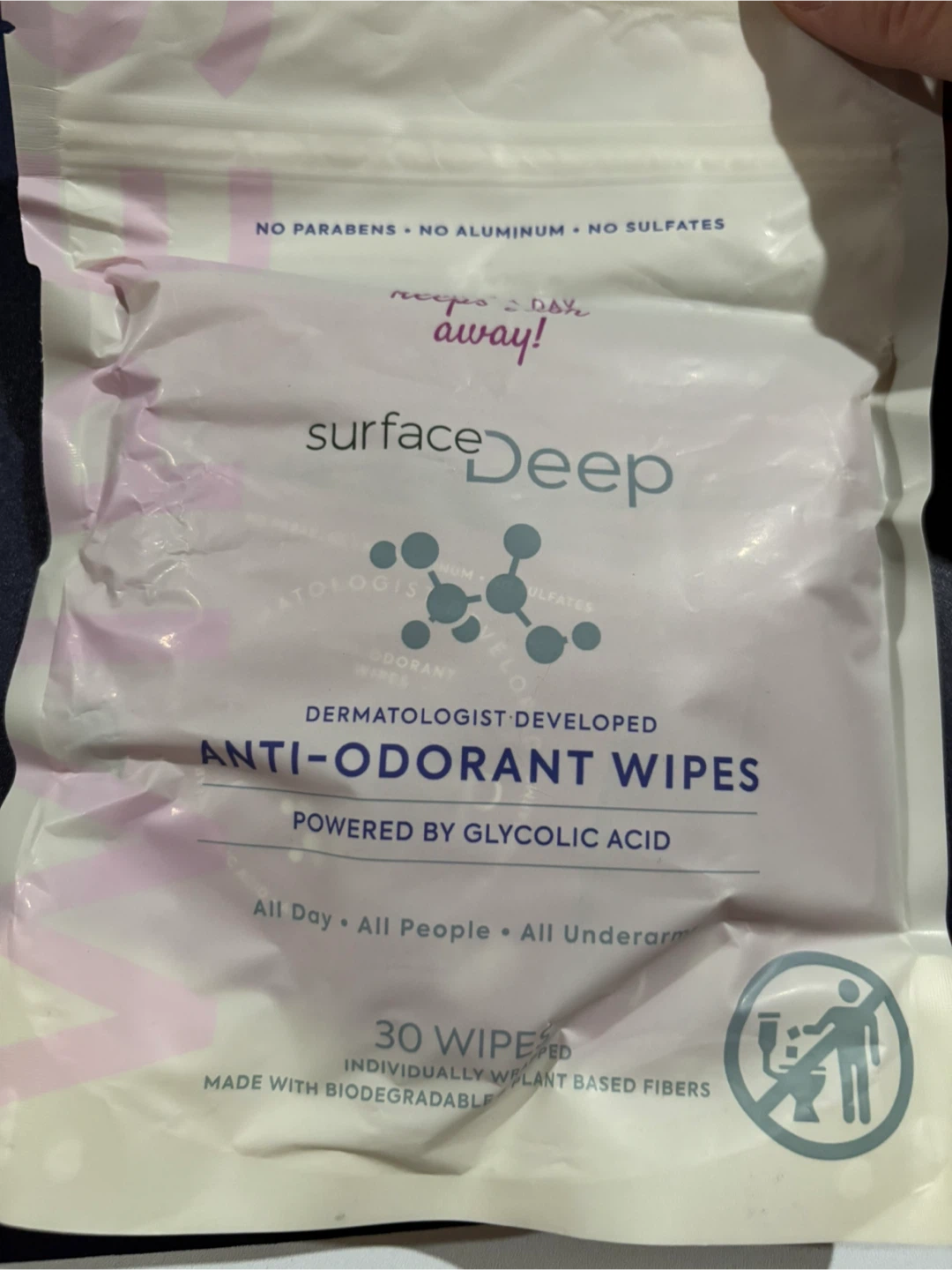 Selling a pack of Surface Deep anti-odourant wipes. These are dermatologist developed and powered by glycolic acid. They're perfect for all day use, for all people, and all underarms! Each pack contains 30 individually wrapped wipes, made with biodegradable plant based fibers. Originally bought for $31.54