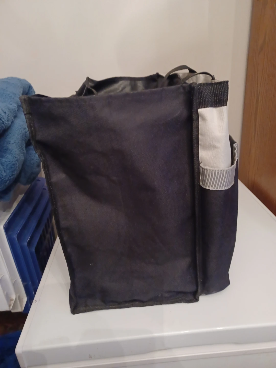 This insulated lunch bag from Pampered Chef is great for keeping your food cool. It features a black exterior with a white accent band. The bag has a durable fabric construction and measures approximately 10 inches wide and 14 inches tall. Inside, you'll find multiple compartments to help organize your items.