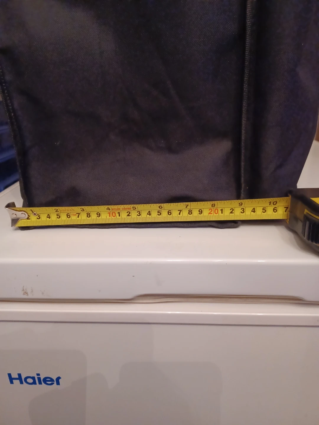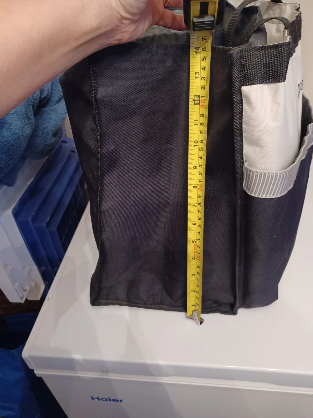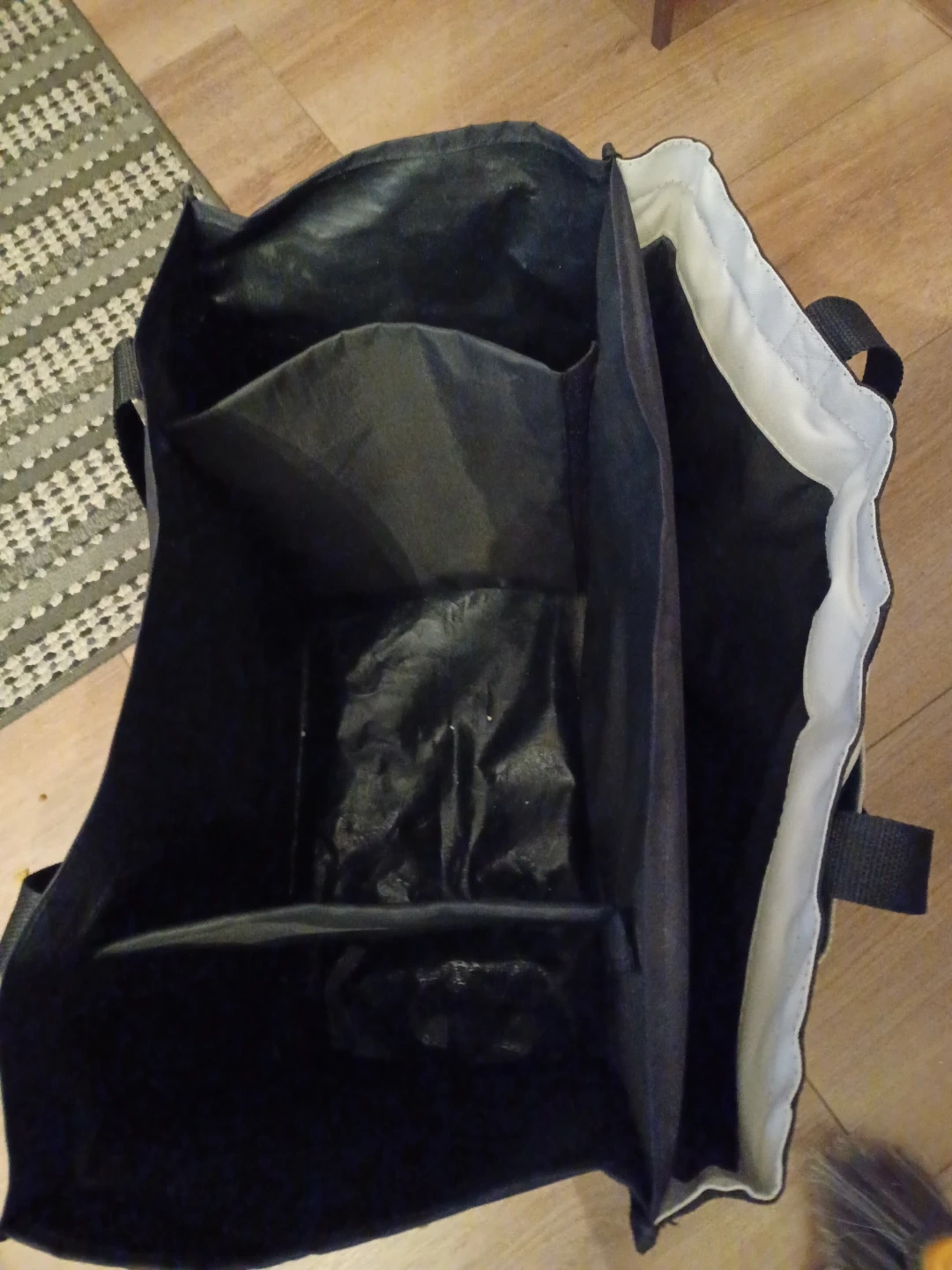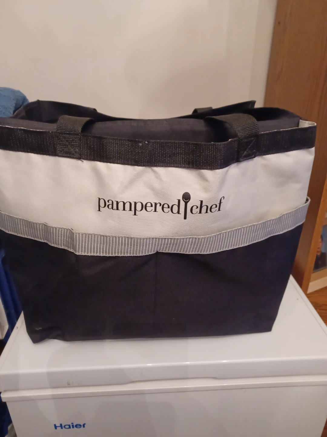 This insulated lunch bag from Pampered Chef is great for keeping your food cool. It features a black exterior with a white accent band. The bag has a durable fabric construction and measures approximately 10 inches wide and 14 inches tall. Inside, you'll find multiple compartments to help organize your items.