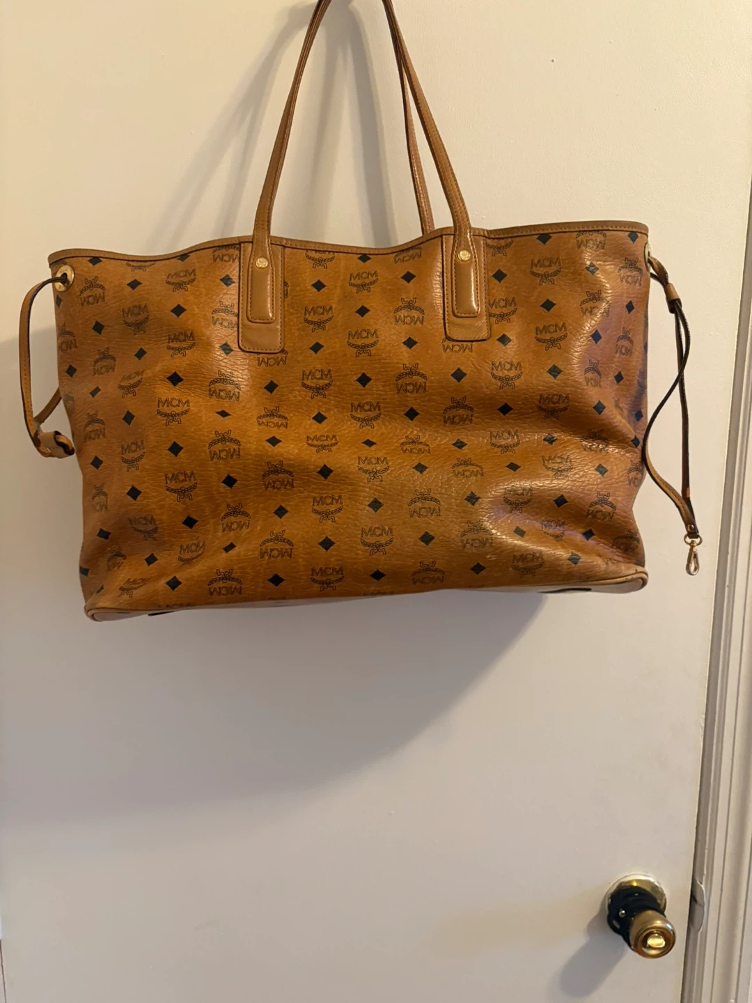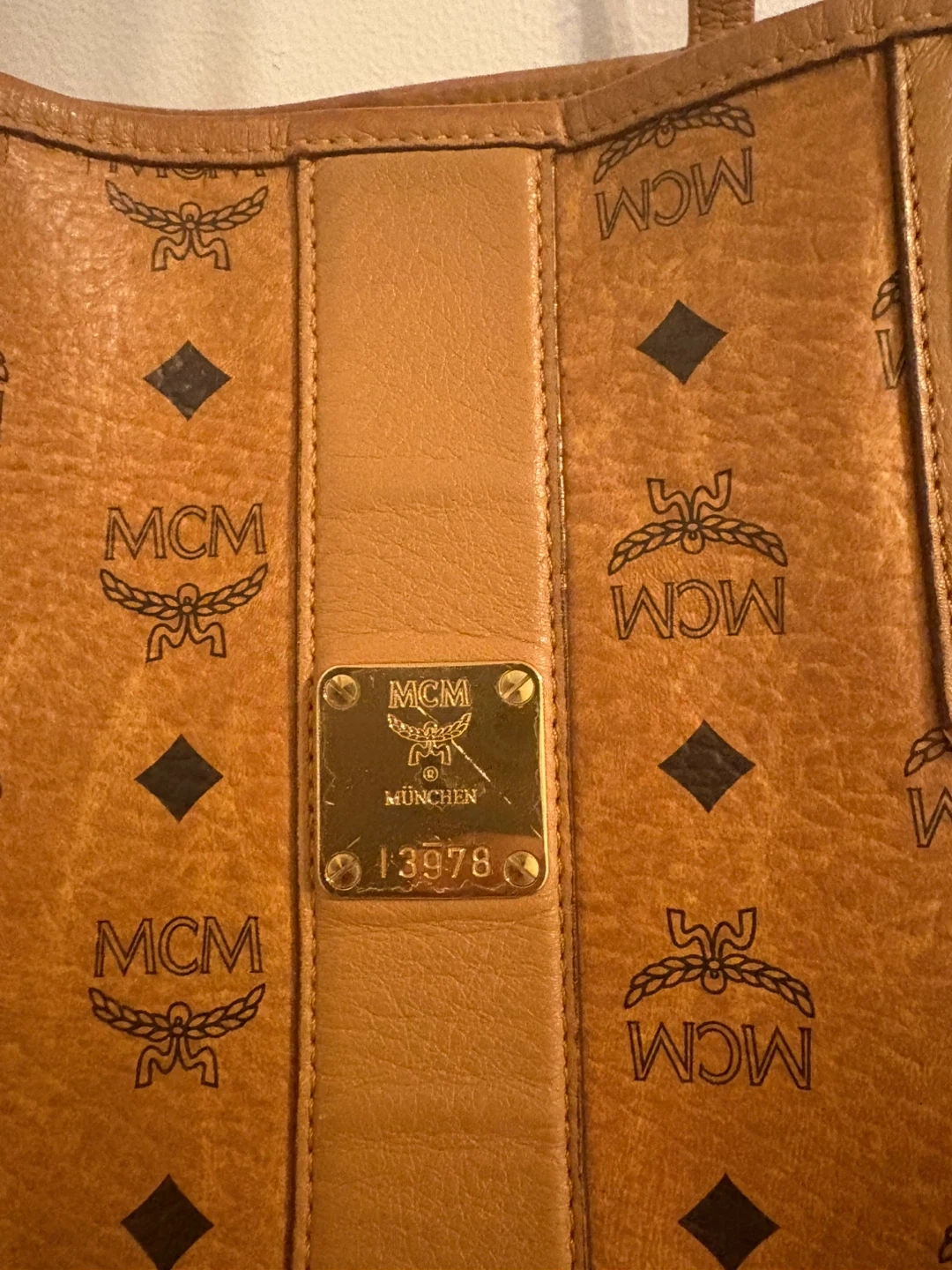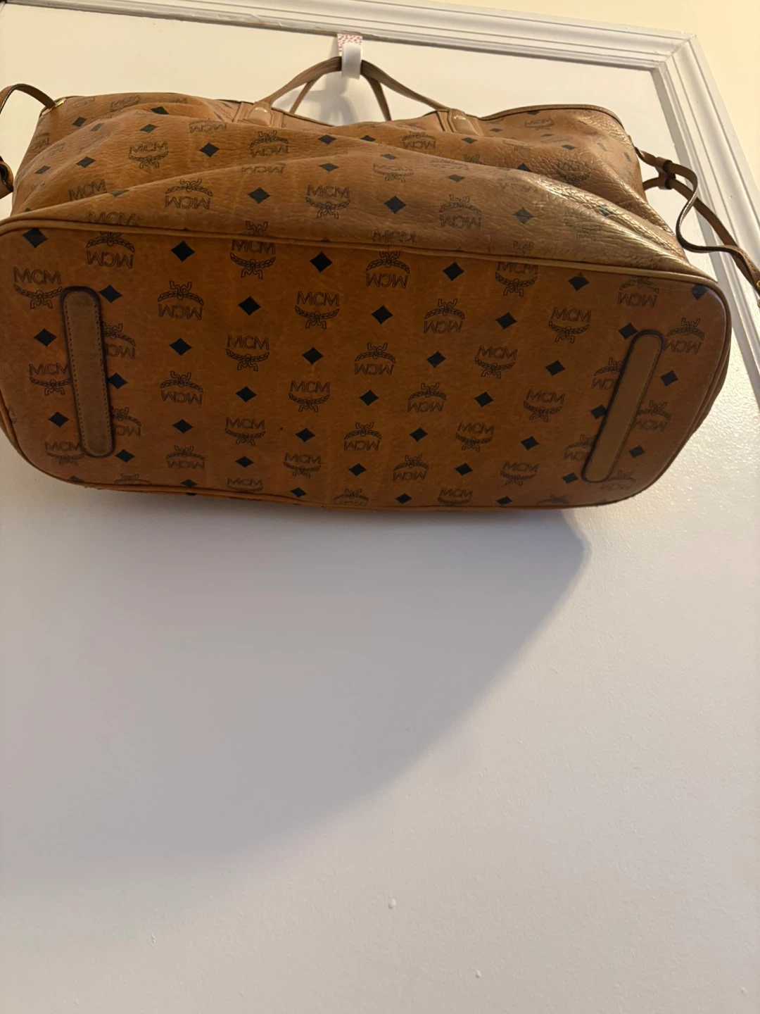 This is a stylish MCM tote bag with a unique vintage design. It features the classic MCM logo pattern. The bag shows some signs of wear, adding to its vintage charm. It's a great everyday bag!