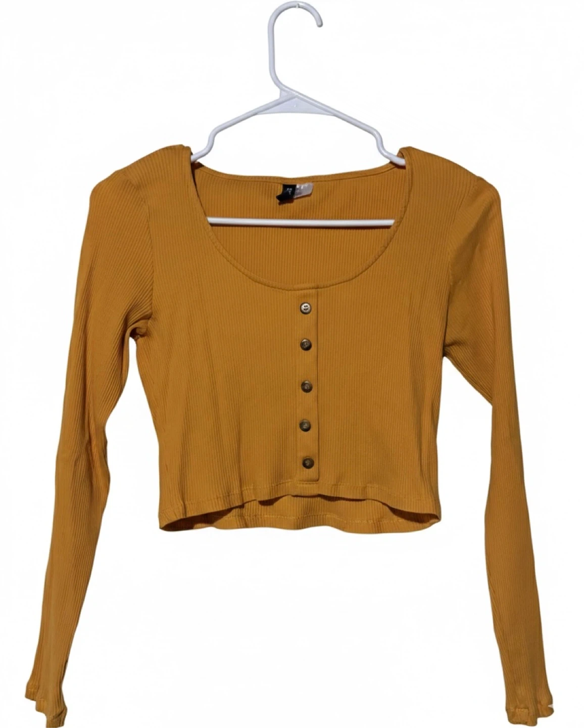 Cropped Button-Up Long Sleeve Top - Mustard Yellow