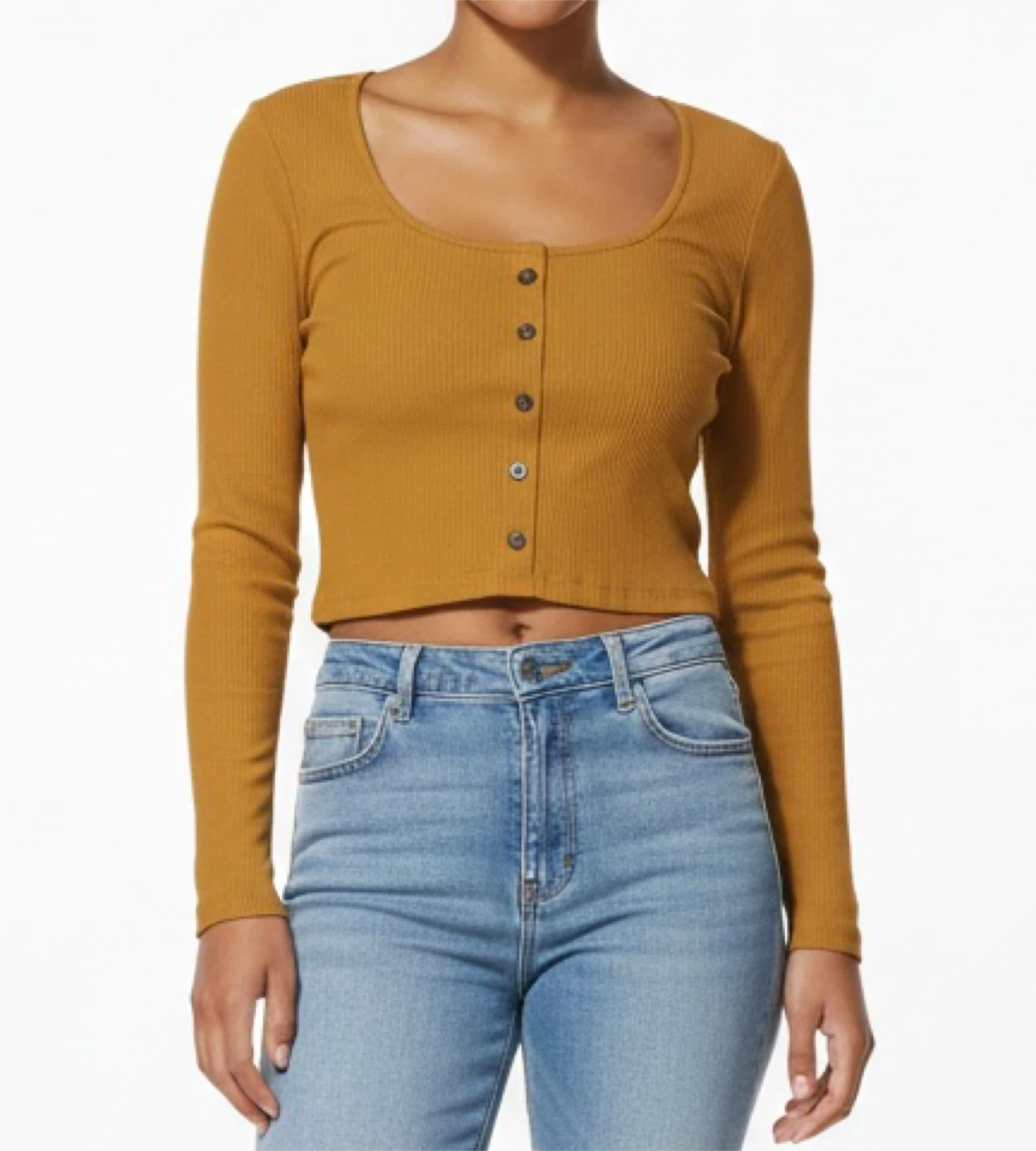 Cropped Button-Up Long Sleeve Top - Mustard Yellow