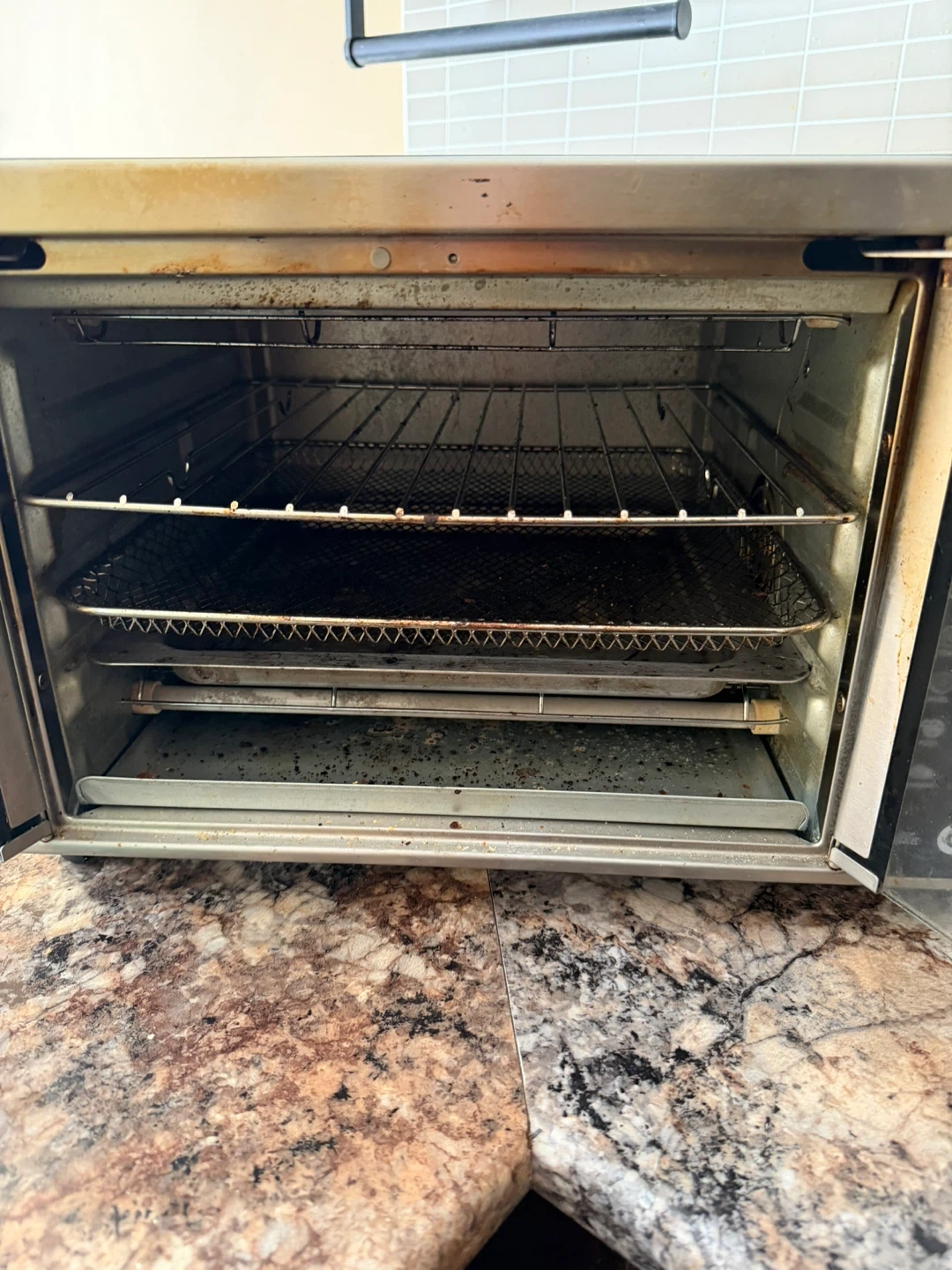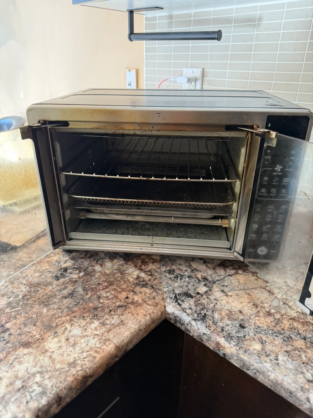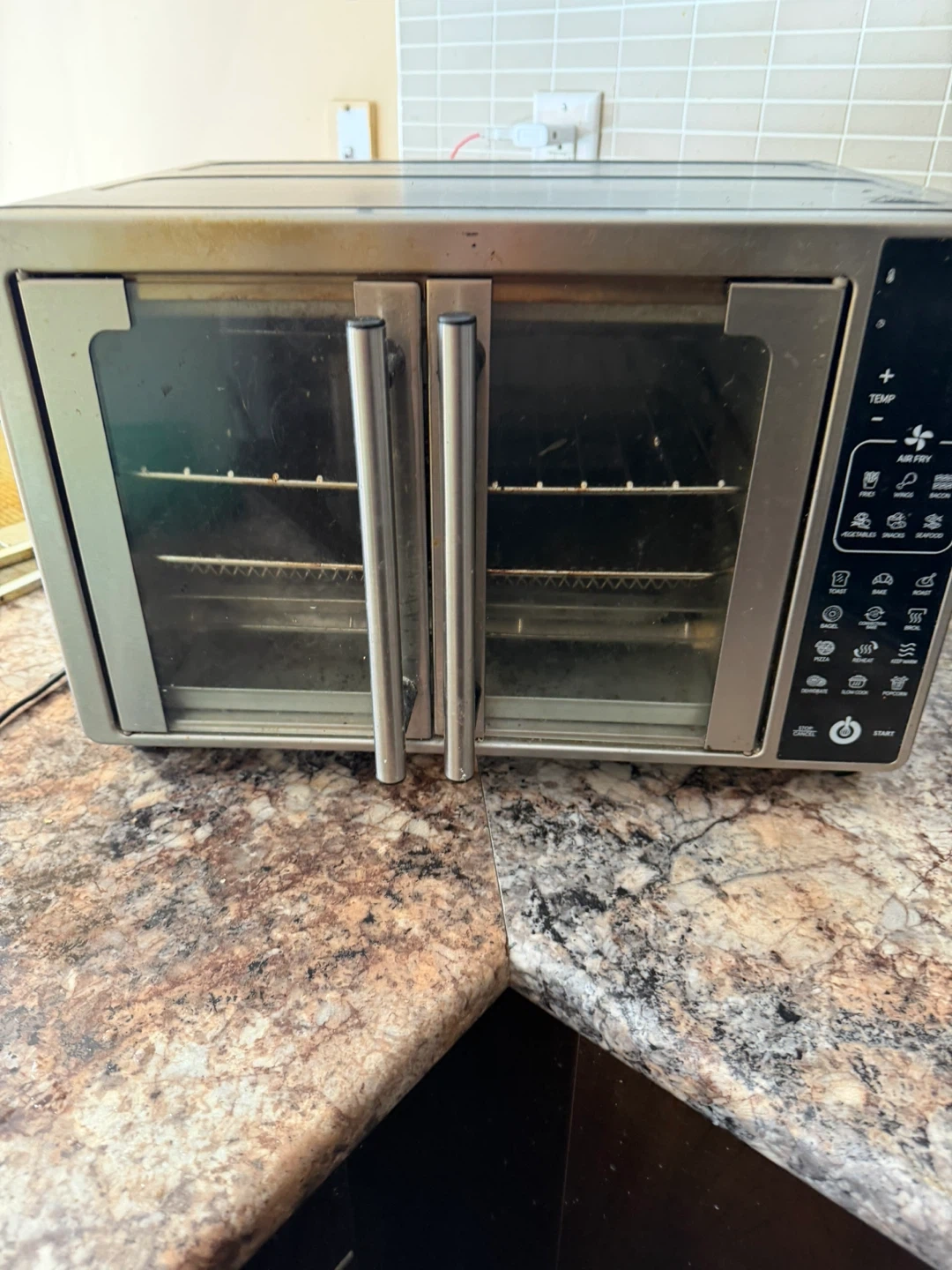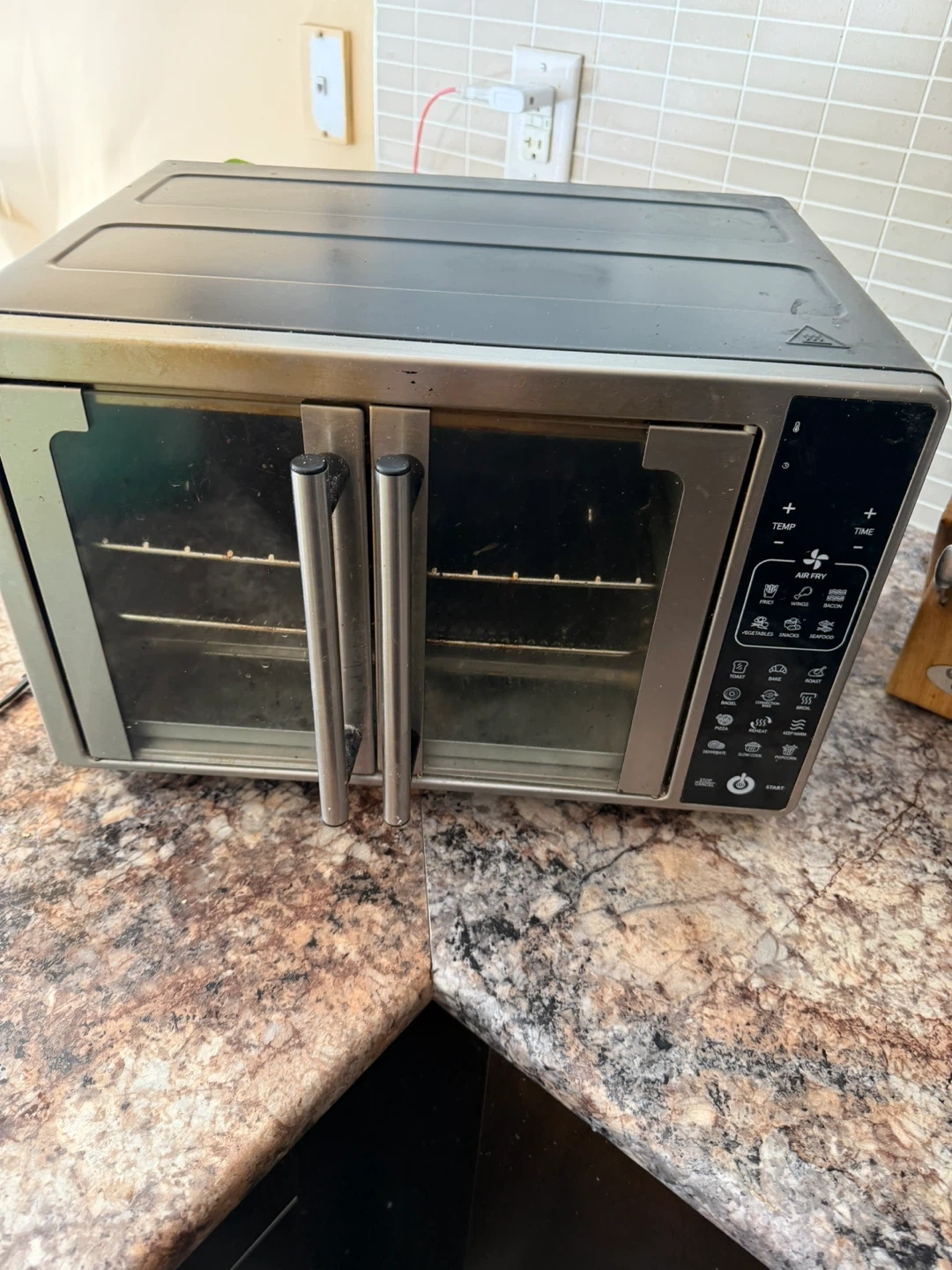This is a Chefman air fryer toaster oven. It has multiple functions including air fry and bake. The interior has two racks and a drip tray.