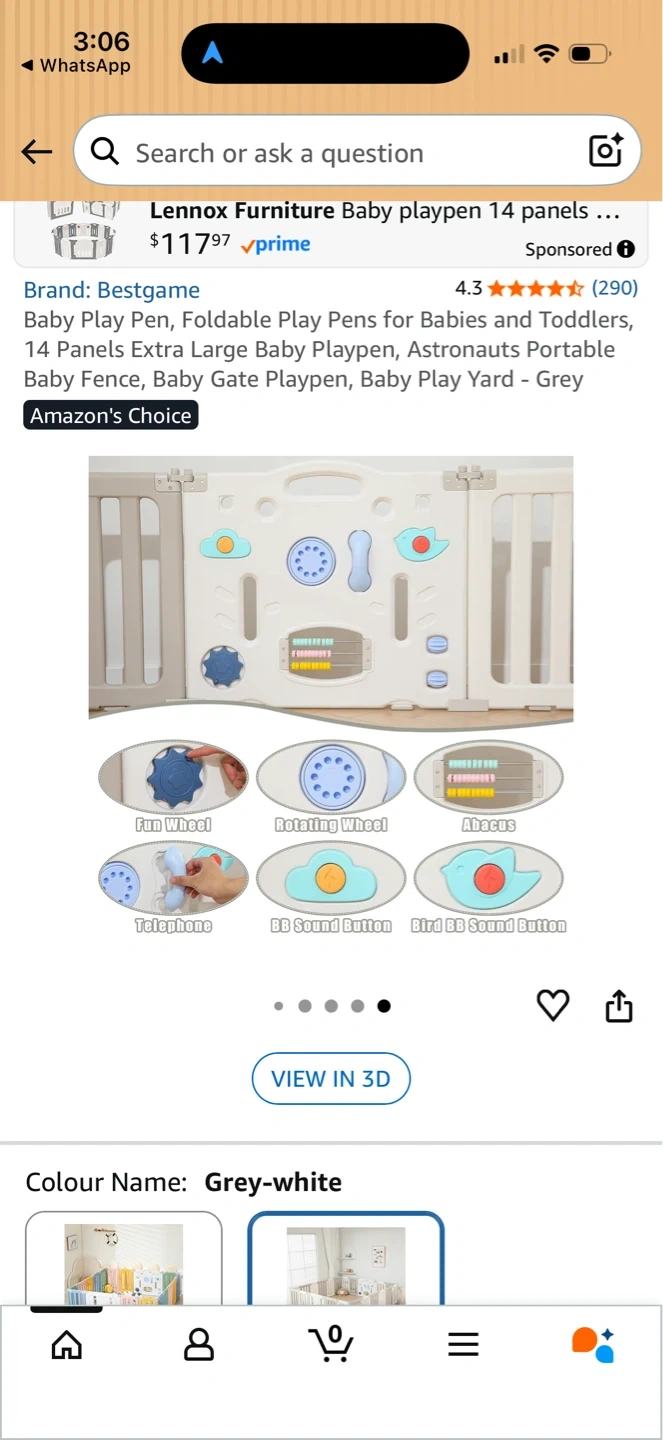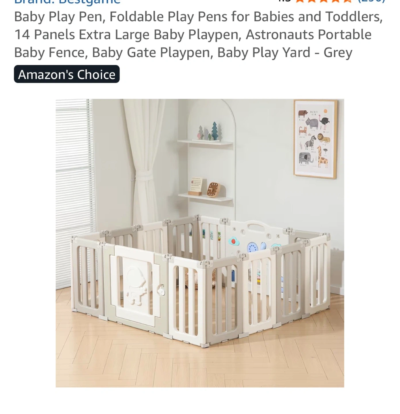 This is a Bestgame baby playpen with 14 panels. It's grey-white in colour. Includes fun wheel, rotating wheel, abacus, and sound buttons. Missing the phone.