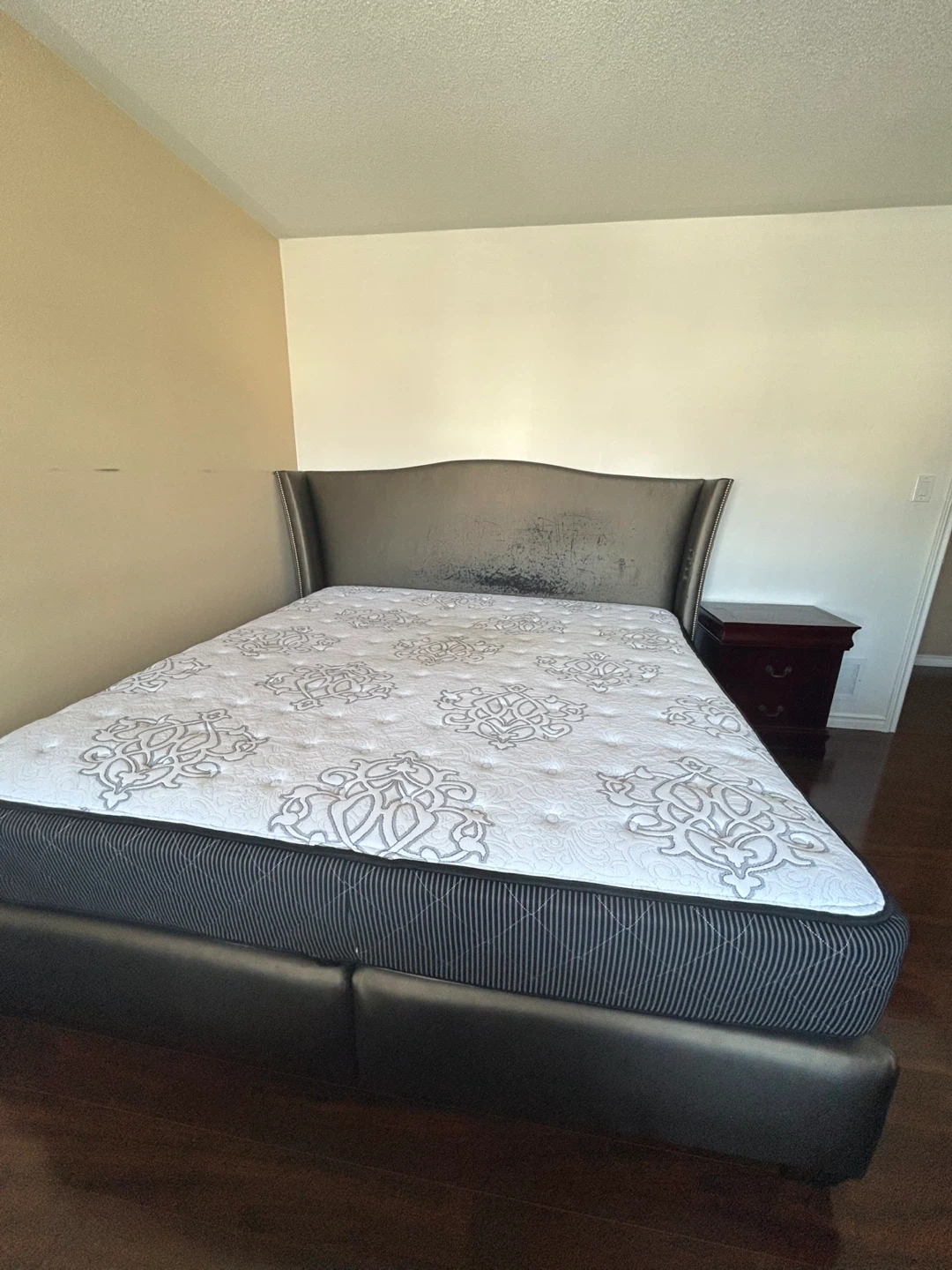 This is a king-sized wingback bed frame upholstered in dark grey faux leather. The headboard has some scuffing and marks. Includes a matching mattress with a grey and white patterned top. Must to go immediately. Pick up in Whitby.