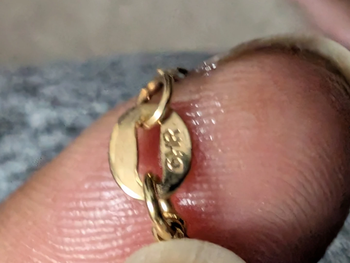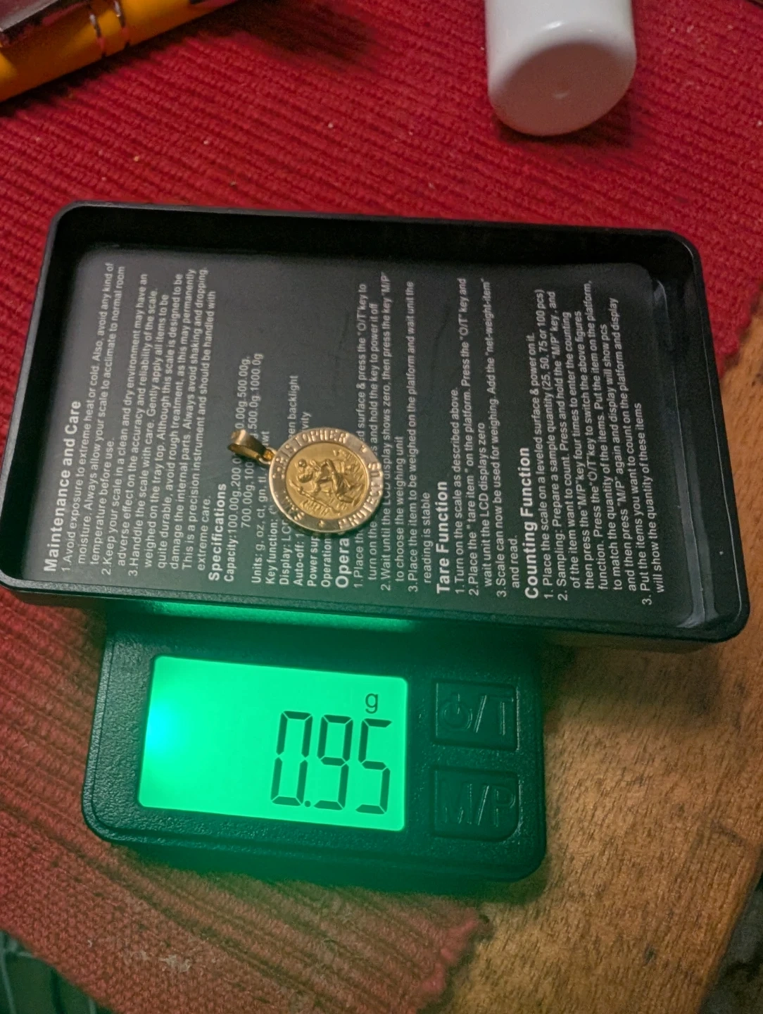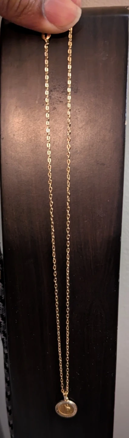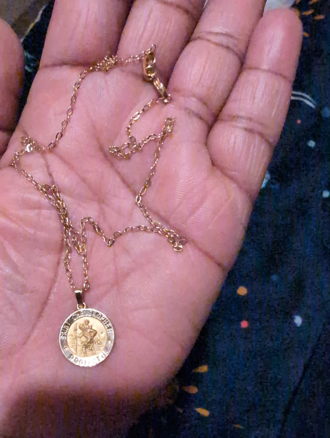 The pendant is 14k gold with a depiction of Saint Christopher with the words 'Saint Christopher Protect Us" .
