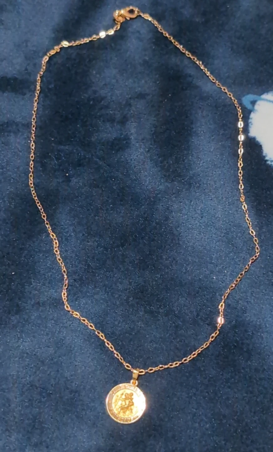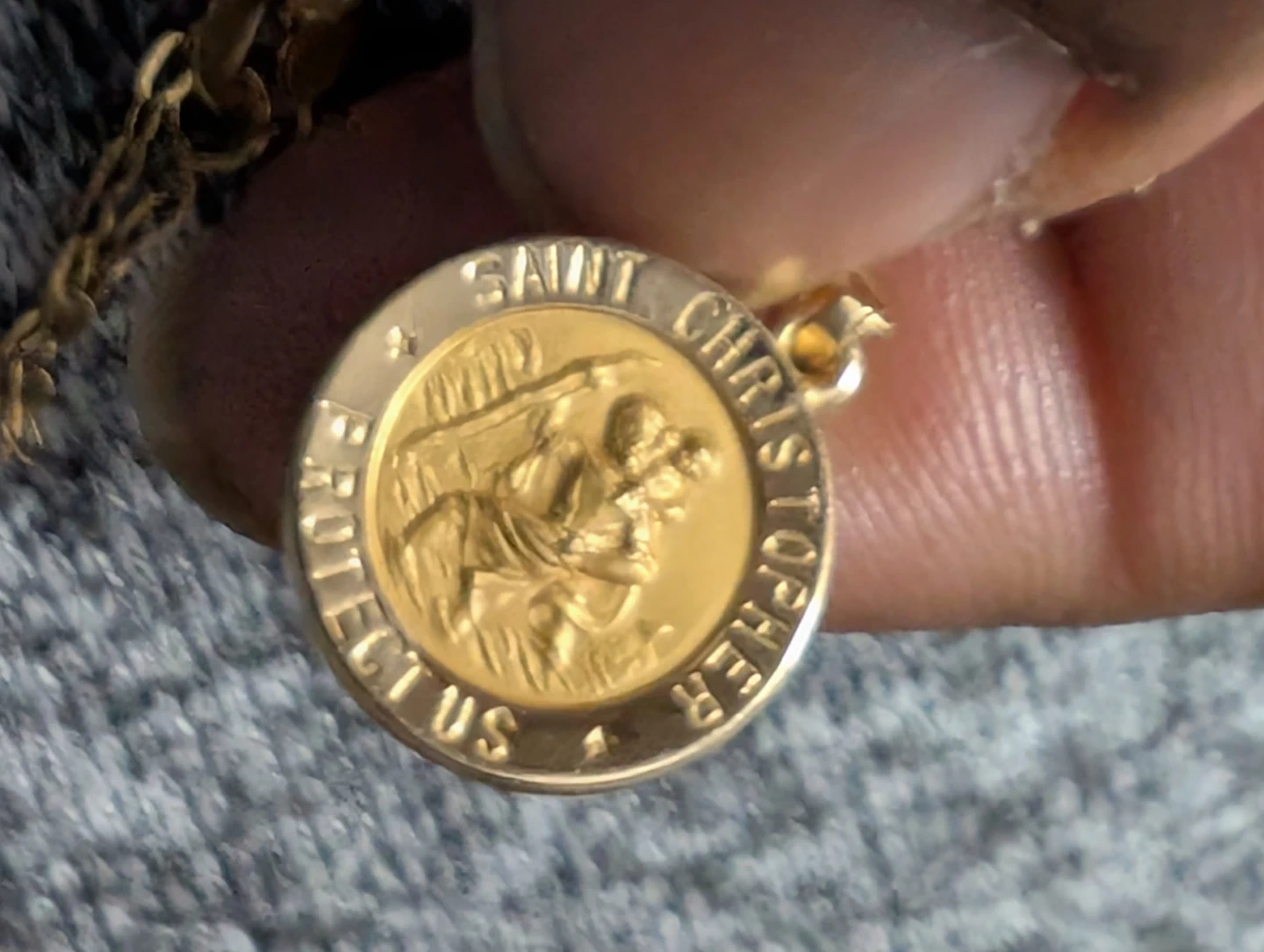 The pendant is 14k gold with a depiction of Saint Christopher with the words 'Saint Christopher Protect Us" .