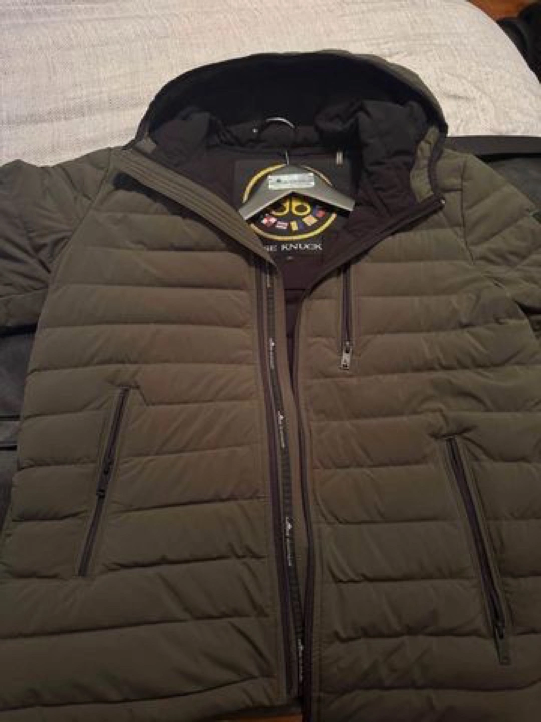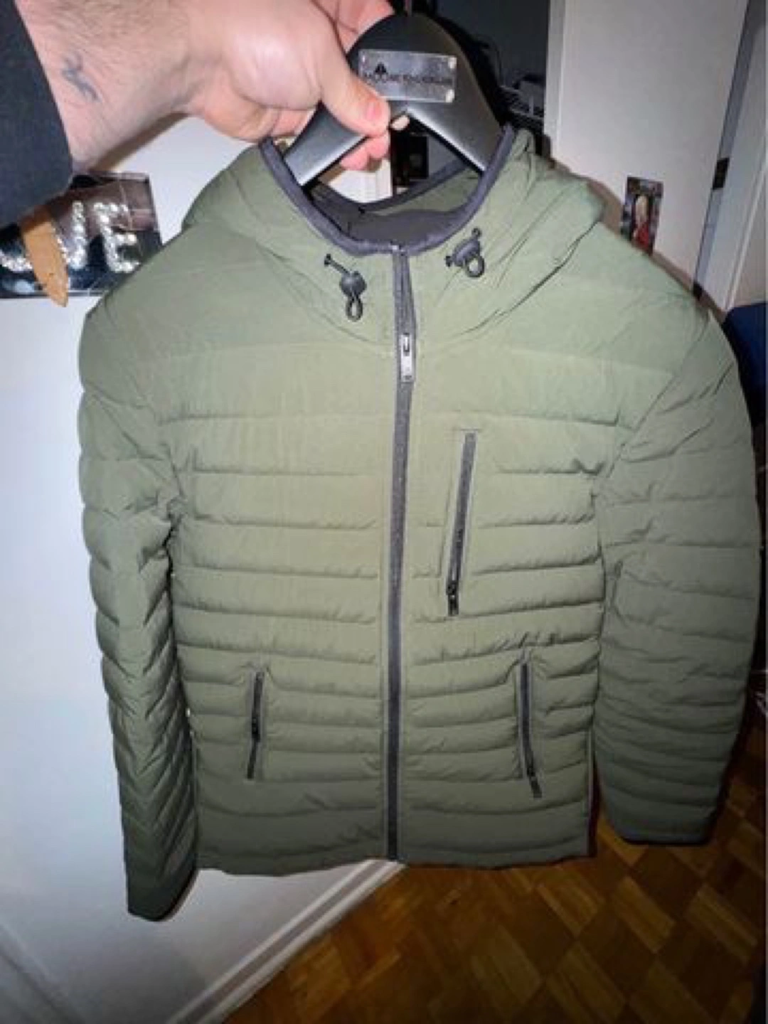 Men's olive green puffer jacket. Features a hood and zipper closure. Multiple pockets. Comes with garment bag.