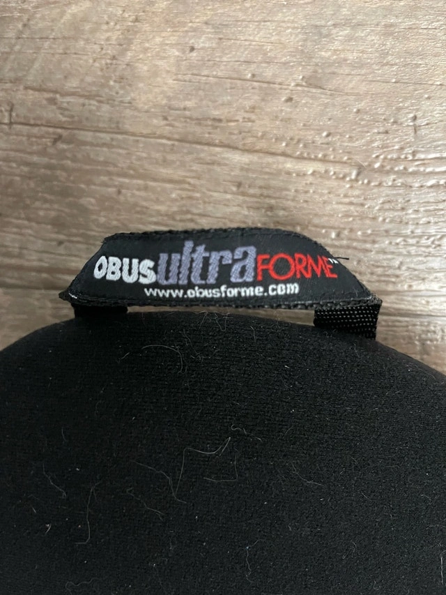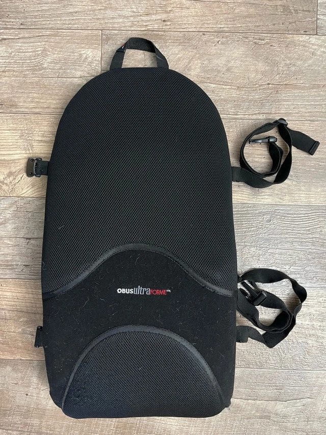 This ObusForme backrest support provides excellent lumbar support for long days at the office or in the car. It's in used condition and ready to provide comfort where you need it most. Key features include an ergonomic design for proper posture, breathable mesh fabric, and adjustable straps for a versatile fit. If the ad is still up, the backrest is available.
