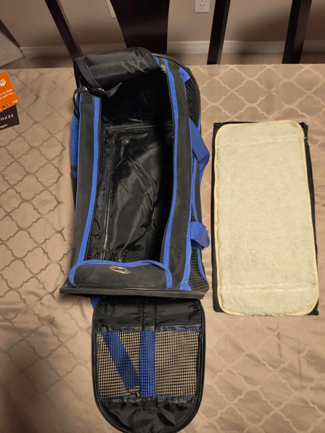 It's in great condition and comes with a soft, comfy pad for your furry friend. Includes shoulder strap and flip up side panel.