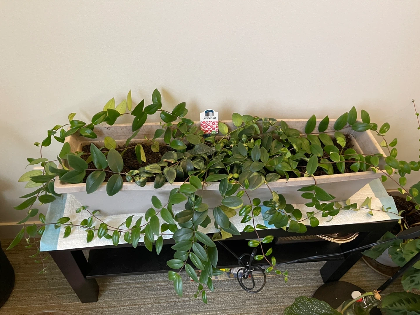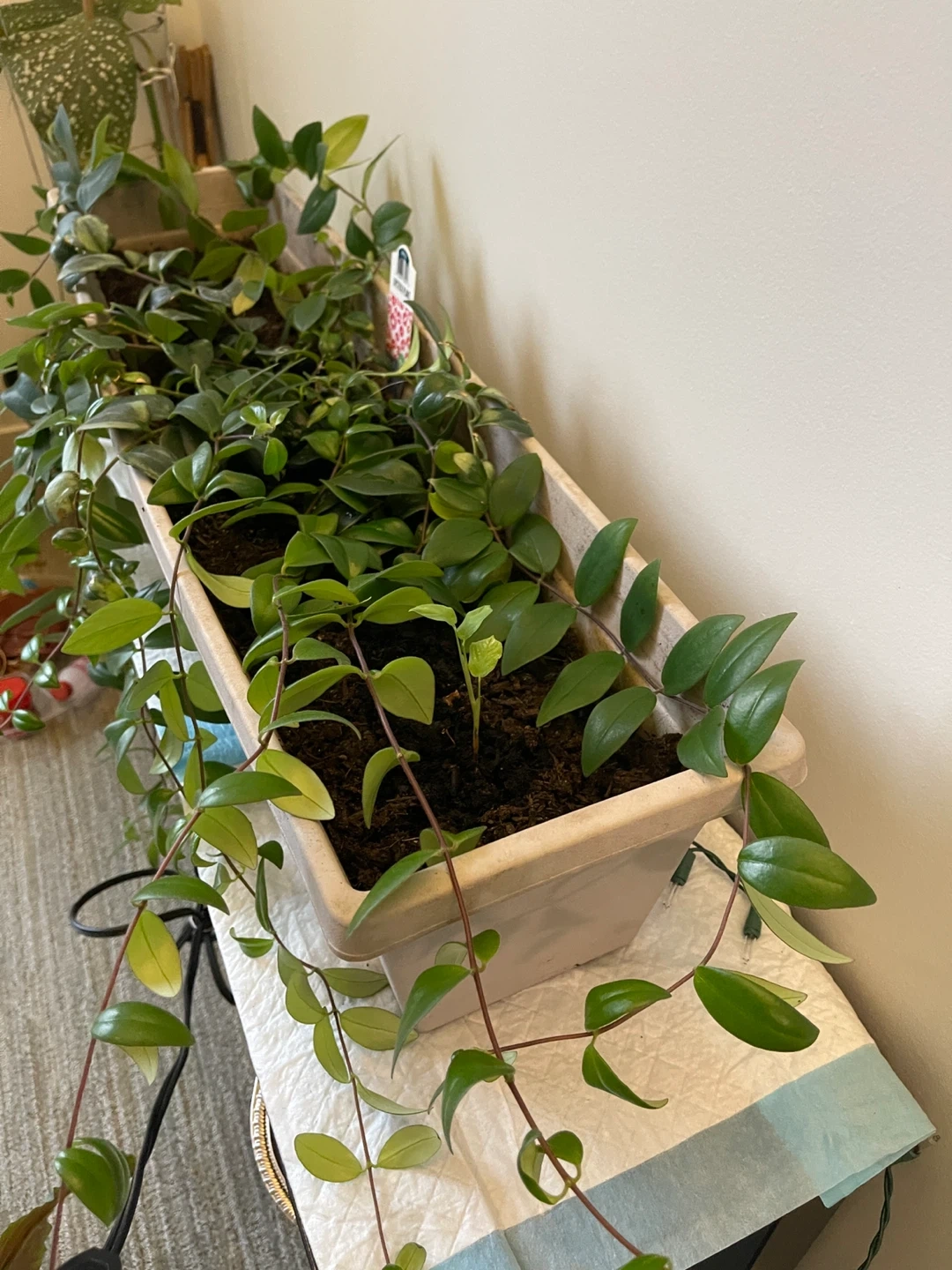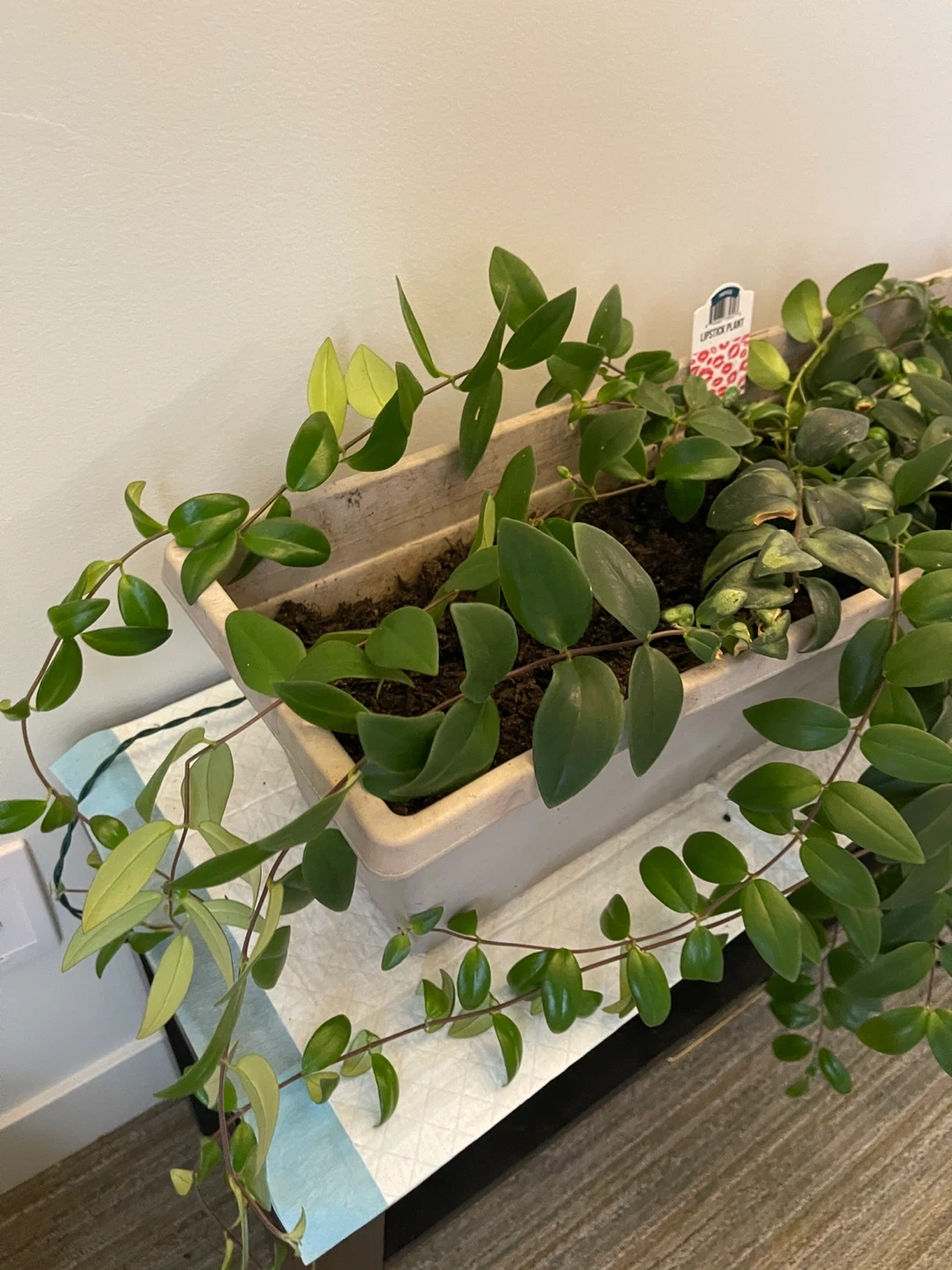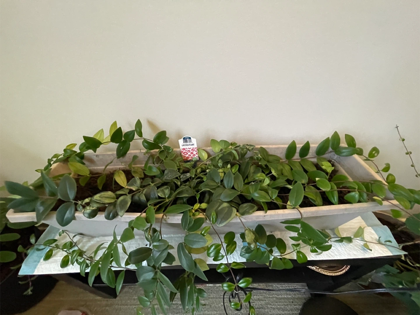 Healthy lipstick plant in a light beige planter with drainage holes. It's a trailing plant with lush green leaves. Lots of new growth is visible, and it's growing fast. Ready for a new home!
