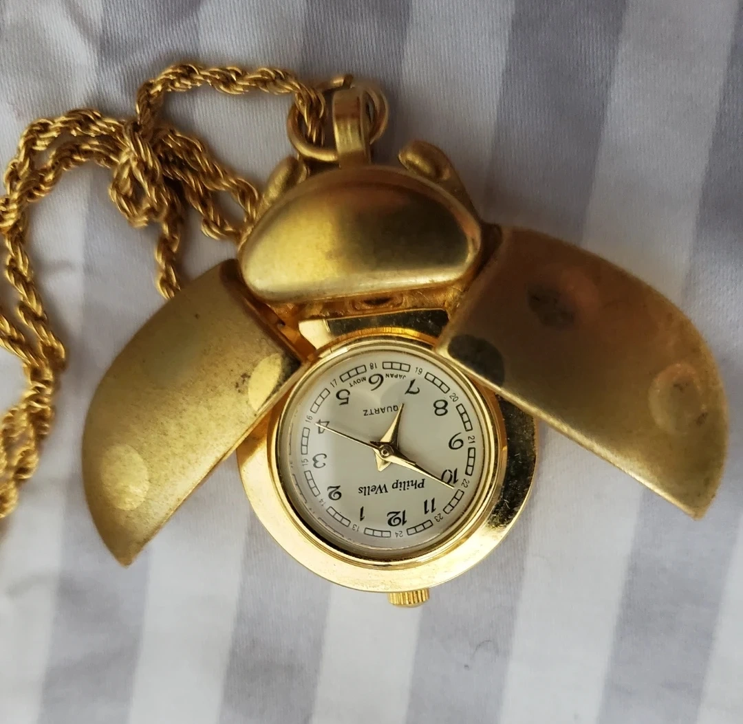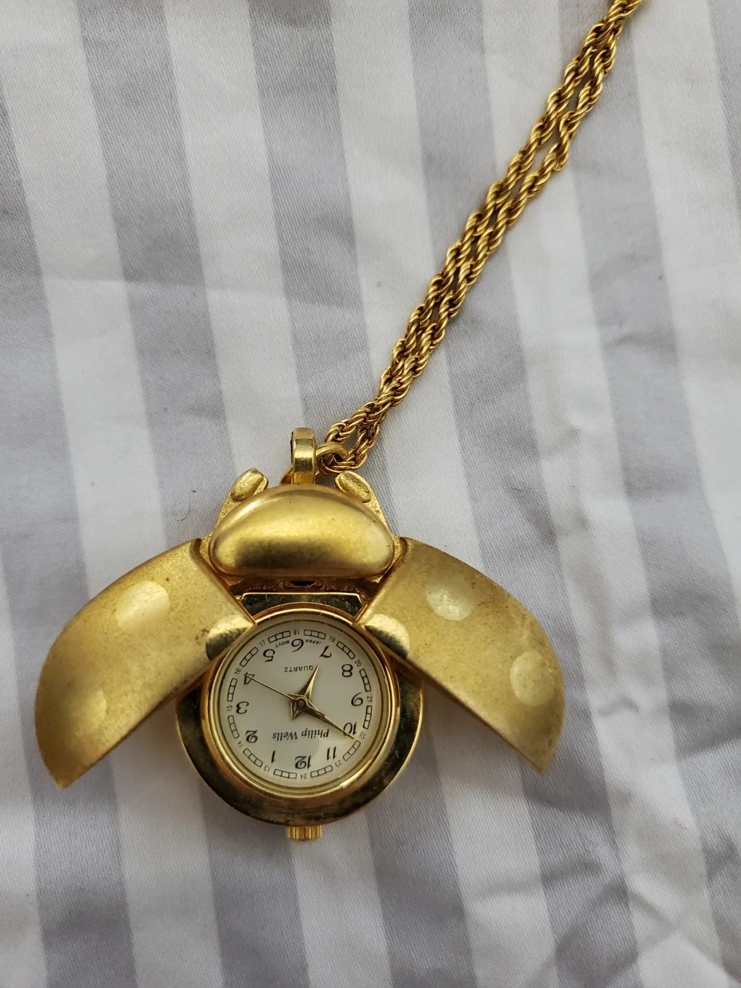 Beautiful piece. Philip wells. Had for approx 20 years. Not sure if real gold, plated etc. But doubt it's real gold since it's slightly tarnished from age. Doesn't come with battery.