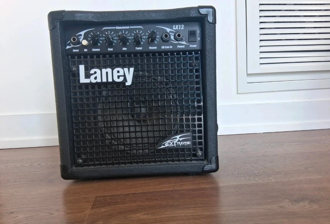 Fender Stratocaster replica, Gibson gig bag, Laney amp