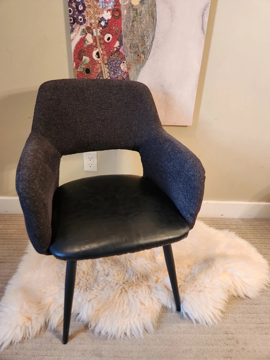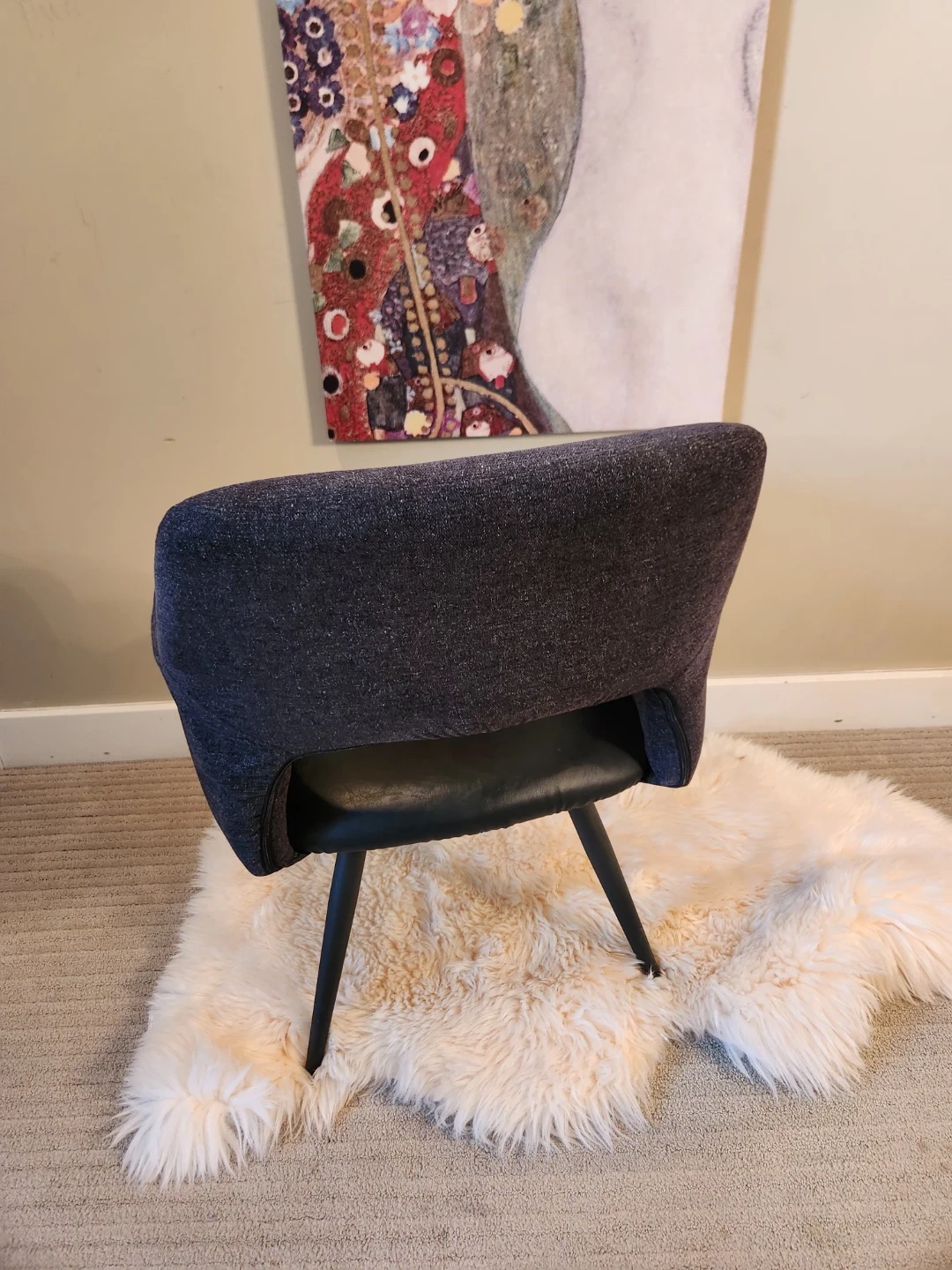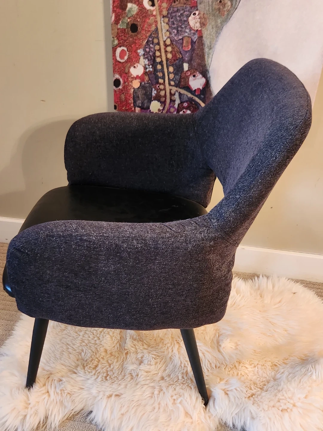 This like new Accent chair featuring dark grey textured upholstery and a black seat has a mid century modern style. Comfortable design with black metal tapered legs makes this chair sturdy and stylish. Makes a fantastic desk or vanity chair. This chair adds sleek sophistication to any living space. Seat surface is 18x20 and 17 inches high, arms are 22 inches apart, top of chair back is 30 inches high.