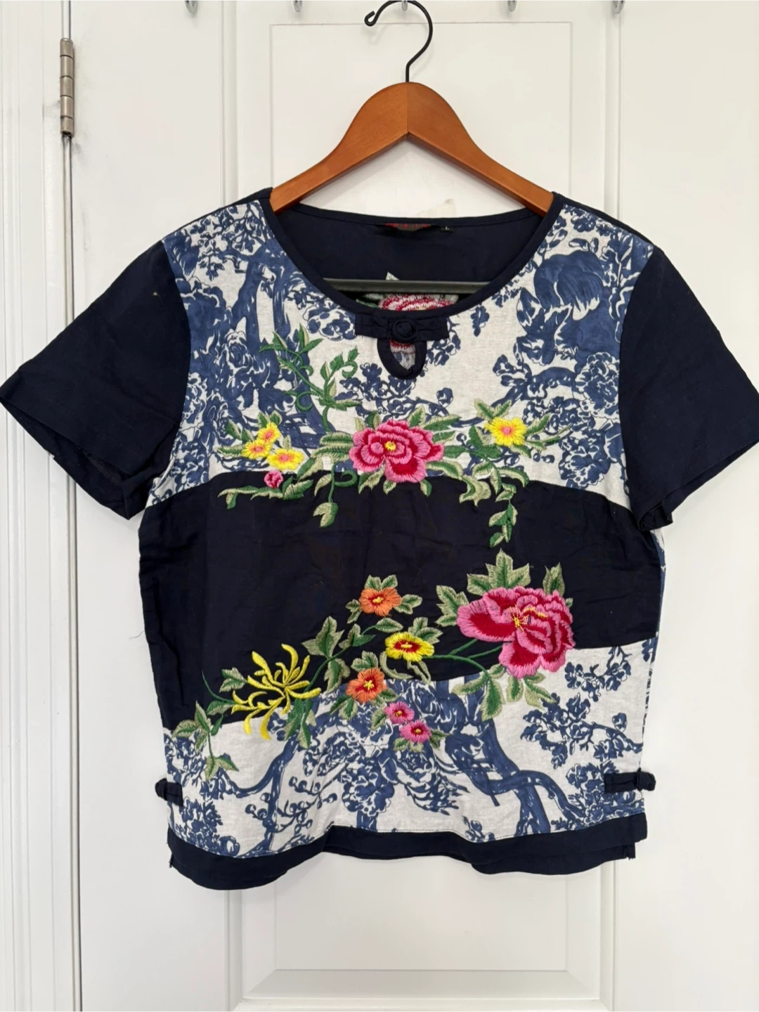 Great condition short sleeved top embroidered with flowers. Perfect for spring! Size large. Knot details on the sides. (See last photo.) No imperfections. Pickup near Sherbourne and Adelaide Street East or sometimes at some TTC stations.