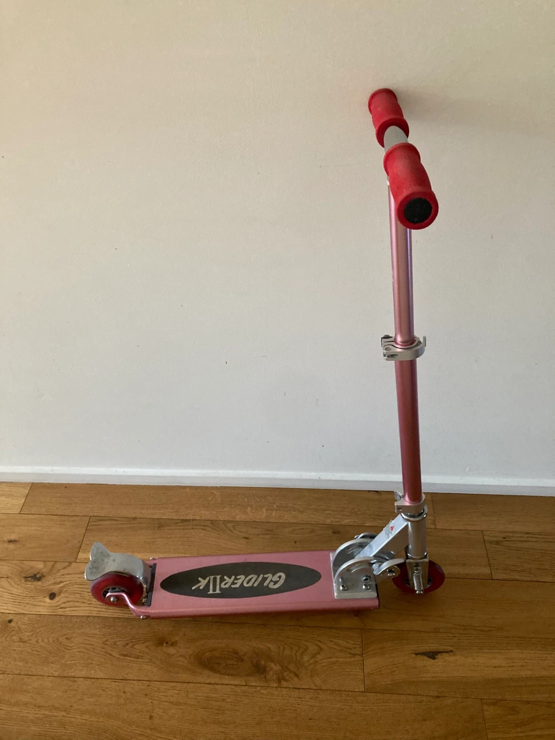 A pink GliderIK scooter for kids. It has red hand grips and silver metal components. This scooter is great for outdoor fun!